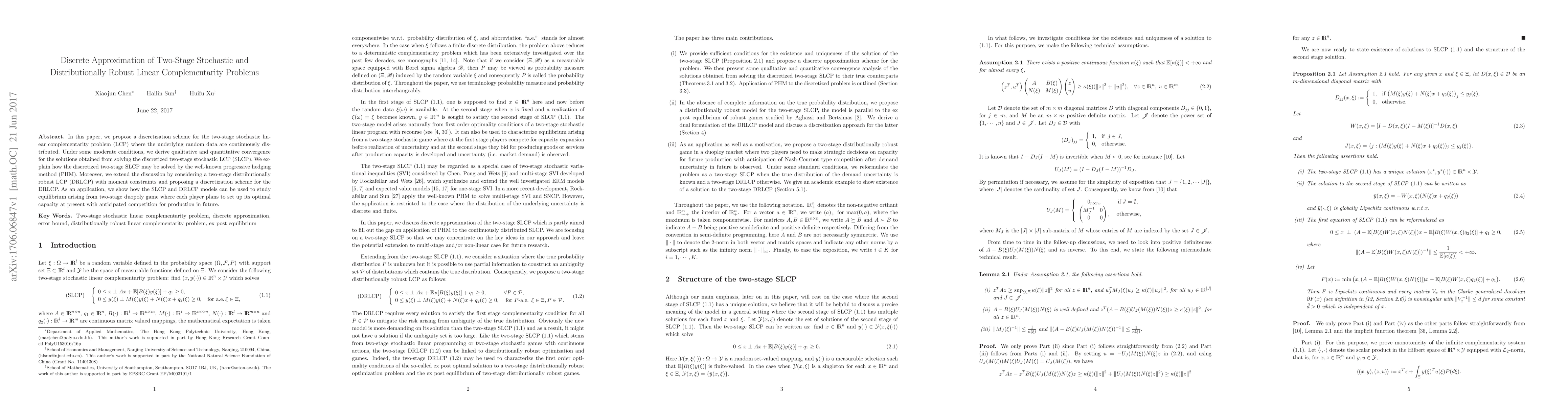 This paper proposes a discretization scheme for two-stage stochastic and distributionally robust linear complementarity problems, showing convergence under moderate conditions and applying it to study equilibrium in duopoly games.