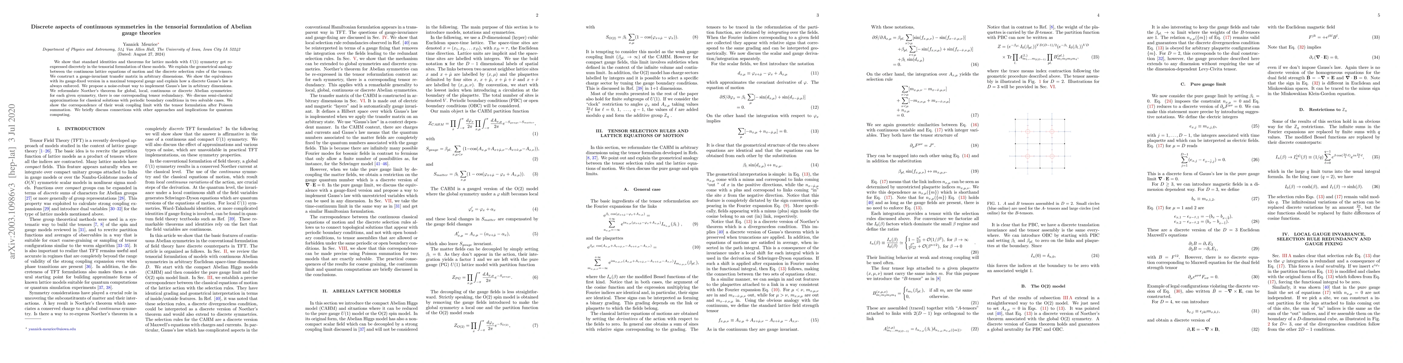 This paper explores the discrete re-expression of continuous symmetries in the tensorial formulation of $U(1)$ Abelian gauge theories, constructing a gauge-invariant transfer matrix and demonstrating equivalence with its gauge-fixed version, while proposing a robust method to implement Gauss's law. It also reformulates Noether's theorem for various symmetries and discusses semi-classical approximations and connections to quantum computing.