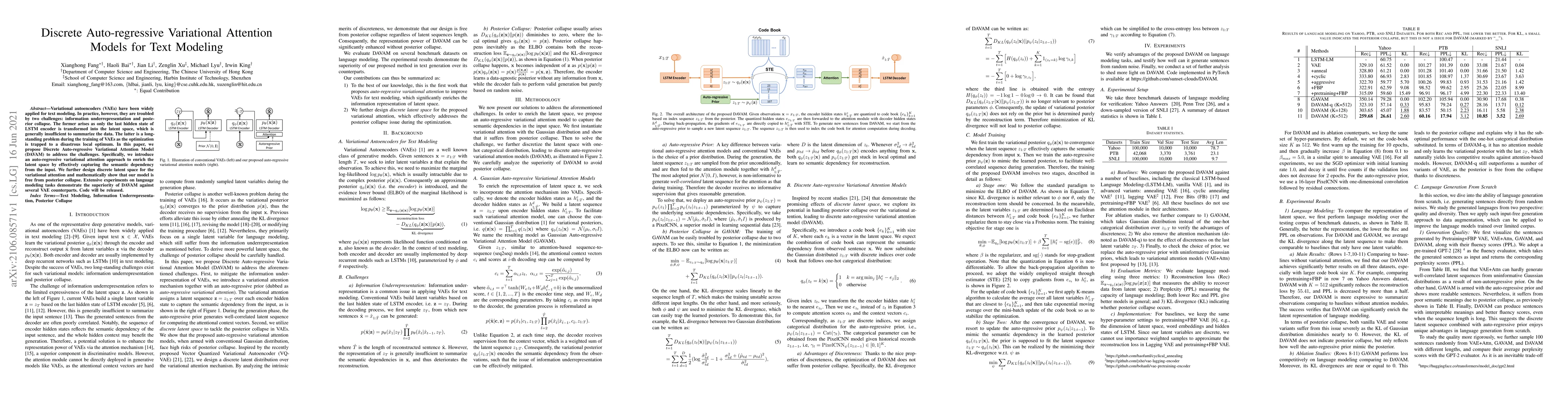This paper proposes the Discrete Auto-regressive Variational Attention Model (DAVAM) to improve text modeling using variational autoencoders by addressing information underrepresentation and posterior collapse through an auto-regressive variational attention mechanism and a discrete latent space. Experiments show DAVAM outperforms other VAE models in language modeling tasks.
