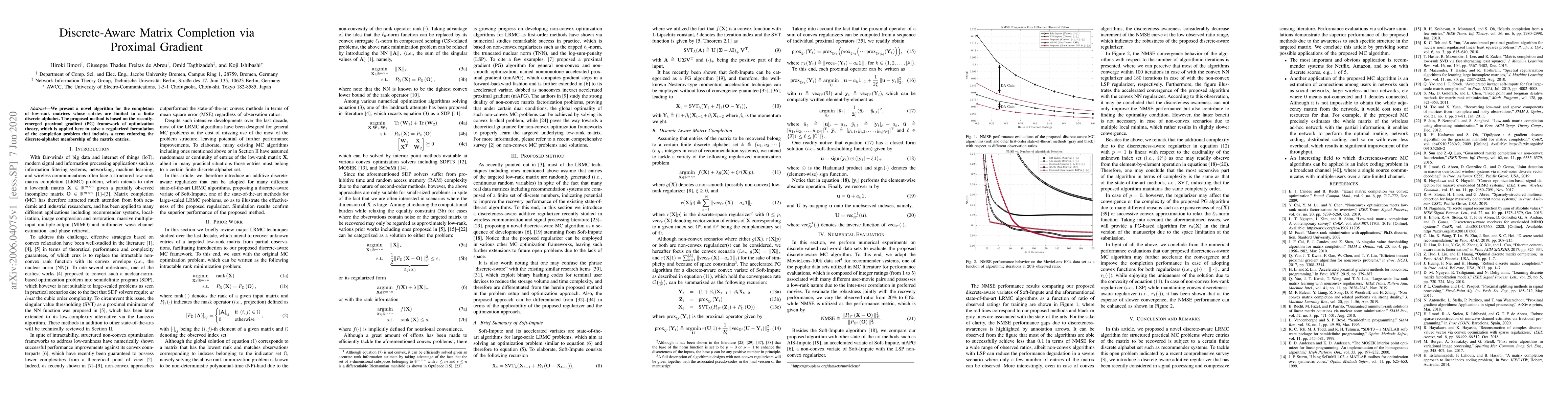 This paper introduces a novel algorithm for completing low-rank matrices with entries constrained to a finite discrete set using the proximal gradient method. The approach solves a regularized matrix completion problem that includes a term enforcing the discrete-alphabet constraint.