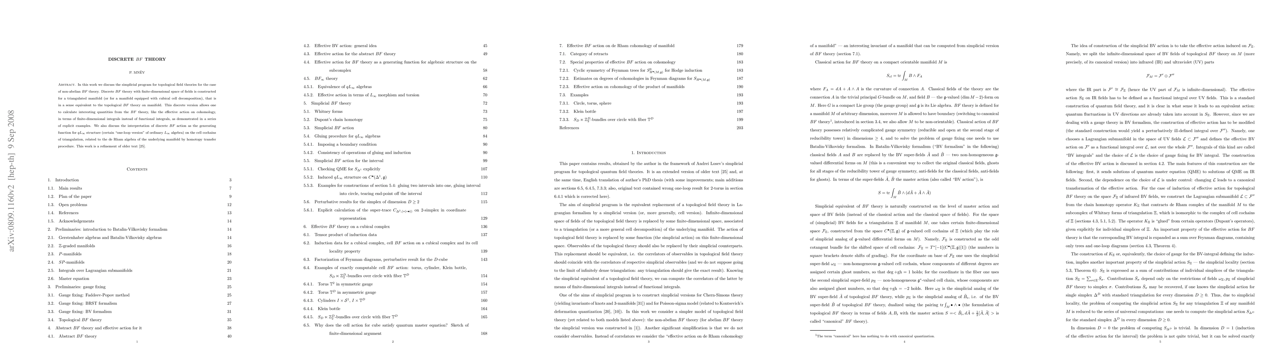 In this work we discuss the simplicial program for topological field theories for the case of non-abelian BF theory. Discrete BF theory with finite-dimensional space of fields is constructed for a triangulated manifold (or for a manifold equipped with cubical cell decomposition), that is in a sense equivalent to the topological BF theory on manifold. This discrete version allows one to calculate interesting quantities from the BF theory, like the effective action on cohomology, in terms of finite-dimensional integrals instead of functional integrals, as demonstrated in a series of explicit examples. We also discuss the interpretation of discrete BF action as the generating function for $qL_\infty$ structure (certain "one-loop version" of ordinary $L_\infty$ algebra) on the cell cochains of triangulation, related to the de Rham algebra of the underlying manifold by homotopy transfer procedure. This work is a refinement of older text hep-th/0610326.