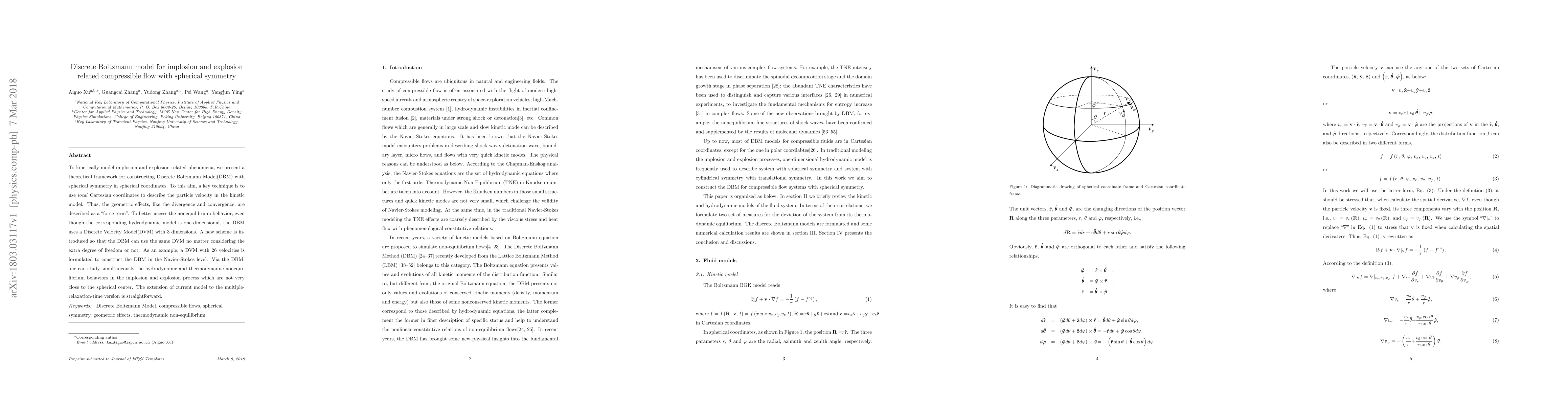 This paper presents a theoretical framework for a Discrete Boltzmann Model (DBM) with spherical symmetry to kinetically model implosion and explosion phenomena. The DBM uses local Cartesian coordinates to describe particle velocity, incorporating geometric effects as a "force term" and employs a Discrete Velocity Model (DVM) with three dimensions for nonequilibrium behavior analysis.