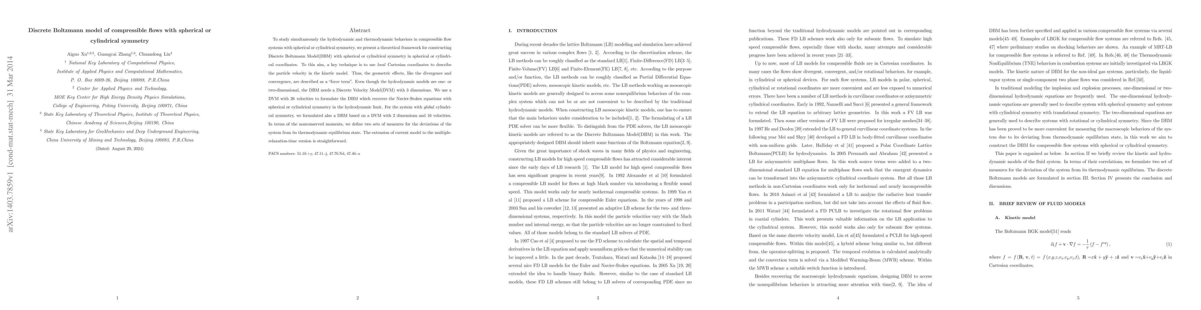 A Discrete Boltzmann Model was developed to study compressible flows with spherical or cylindrical symmetry, recovering Navier-Stokes equations in the hydrodynamic limit.