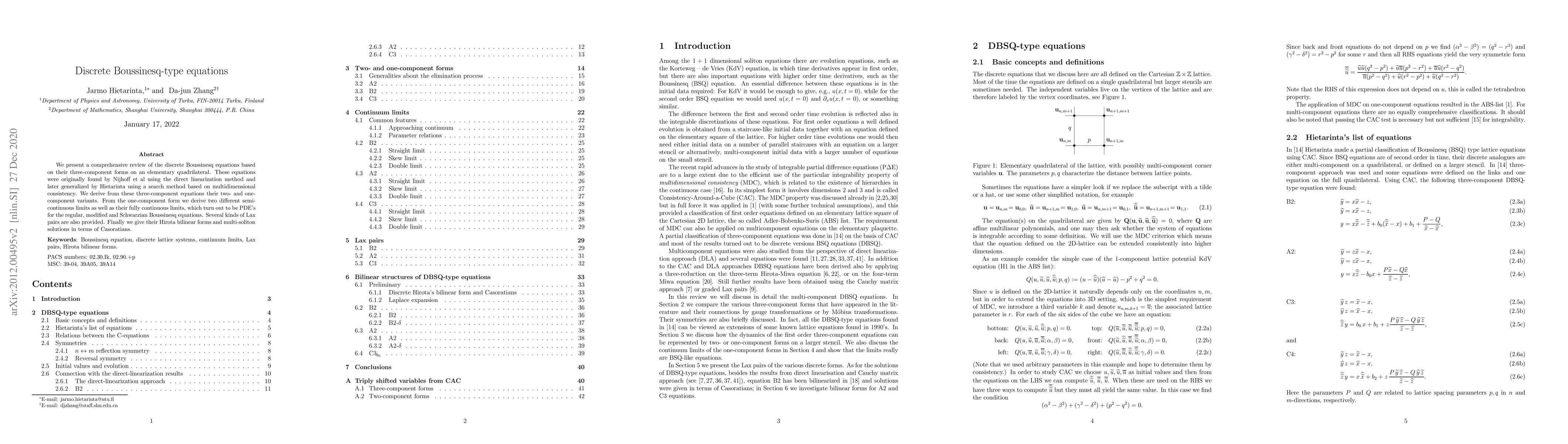 This paper offers a thorough review of discrete Boussinesq equations, derived from three-component forms on quadrilaterals, and their reductions to one and two components. It presents semi-continuous and fully continuous limits leading to PDEs for Boussinesq variants, provides Lax pairs, and gives Hirota bilinear forms and multi-soliton solutions using Casoratians.