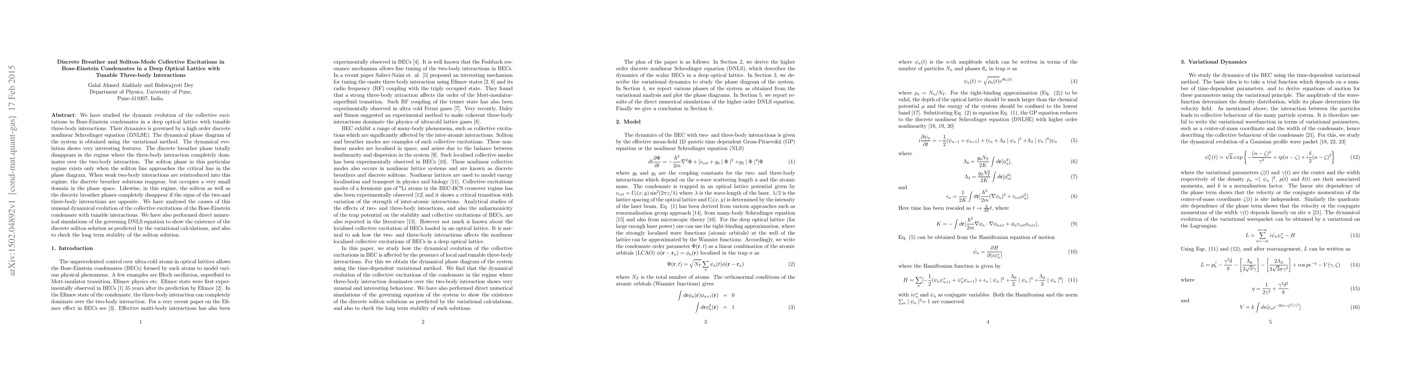 This paper investigates the dynamic behavior of collective excitations in Bose-Einstein condensates within a deep optical lattice, focusing on the interplay between tunable three-body and two-body interactions. The study reveals that discrete breathers vanish when three-body interactions dominate, while solitons only exist near critical thresholds, and both phases disappear under opposite signs of interactions.