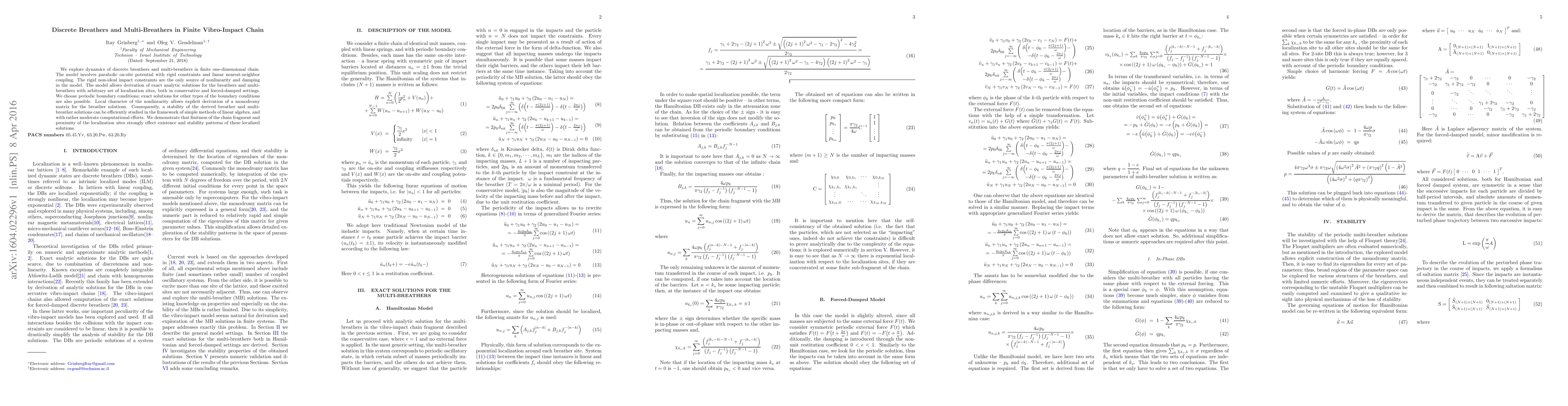 We explore dynamics of discrete breathers and multi-breathers in finite one-dimensional chain. The model involves parabolic on-site potential with rigid constraints and linear nearest-neighbor coupling. The rigid non-ideal impact constraints are the only source of nonlinearity and damping in the model. The model allows derivation of exact analytic solutions for the breathers and multi-breathers with arbitrary set of localization sites, both in conservative and forced-damped settings. We choose periodic boundary conditions; exact solutions for other types of the boundary conditions are also possible. Local character of the nonlinearity allows explicit derivation of a monodromy matrix for the breather solutions. Consequently, a stability of the derived breather and multi-breather solutions can be efficiently studied in the framework of simple methods of linear algebra, and with rather moderate computational efforts. We demonstrate that finitness of the chain fragment and proximity of the localization sites strongly effect existence and stability patterns of these localized solutions.