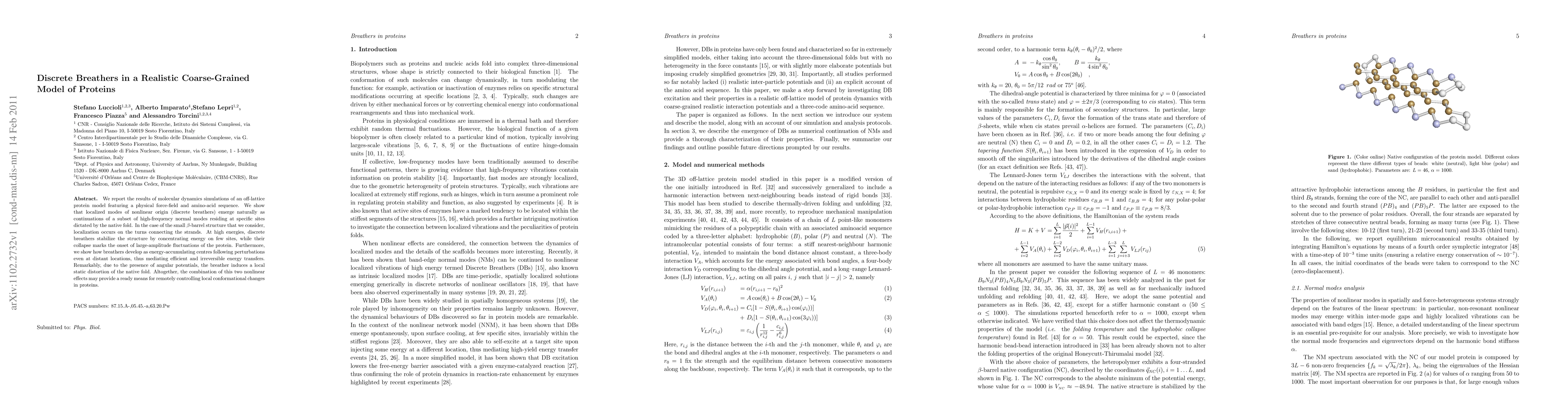 We report the results of molecular dynamics simulations of an off-lattice protein model featuring a physical force-field and amino-acid sequence. We show that localized modes of nonlinear origin (discrete breathers) emerge naturally as continuations of a subset of high-frequency normal modes residing at specific sites dictated by the native fold. In the case of the small $\beta$-barrel structure that we consider, localization occurs on the turns connecting the strands. At high energies, discrete breathers stabilize the structure by concentrating energy on few sites, while their collapse marks the onset of large-amplitude fluctuations of the protein. Furthermore, we show how breathers develop as energy-accumulating centres following perturbations even at distant locations, thus mediating efficient and irreversible energy transfers. Remarkably, due to the presence of angular potentials, the breather induces a local static distortion of the native fold. Altogether, the combination of this two nonlinear effects may provide a ready means for remotely controlling local conformational changes in proteins.