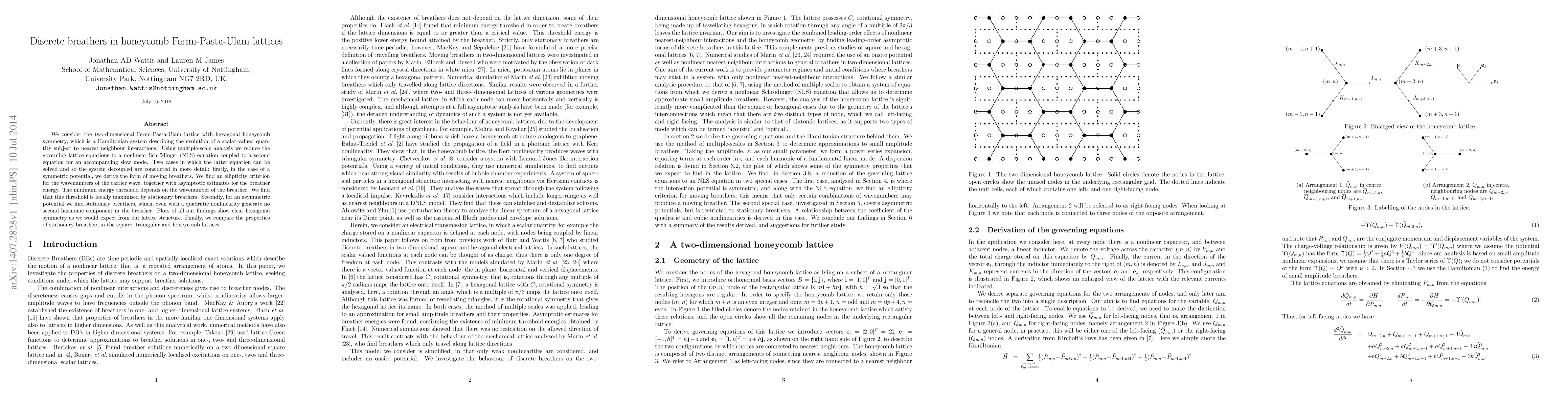 We consider the two-dimensional Fermi-Pasta-Ulam lattice with hexagonal honeycomb symmetry, which is a Hamiltonian system describing the evolution of a scalar-valued quantity subject to nearest neighbour interactions. Using multiple-scale analysis we reduce the governing lattice equations to a nonlinear Schrodinger (NLS) equation coupled to a second equation for an accompanying slow mode. Two cases in which the latter equation can be solved and so the system decoupled are considered in more detail: firstly, in the case of a symmetric potential, we derive the form of moving breathers. We find an ellipticity criterion for the wavenumbers of the carrier wave, together with asymptotic estimates for the breather energy. The minimum energy threshold depends on the wavenumber of the breather. We find that this threshold is locally maximised by stationary breathers. Secondly, for an asymmetric potential we find stationary breathers, which, even with a quadratic nonlinearity generate no second harmonic component in the breather. Plots of all our findings show clear hexagonal symmetry as we would expect from our lattice structure. Finally, we compare the properties of stationary breathers in the square, triangular and honeycomb lattices.
