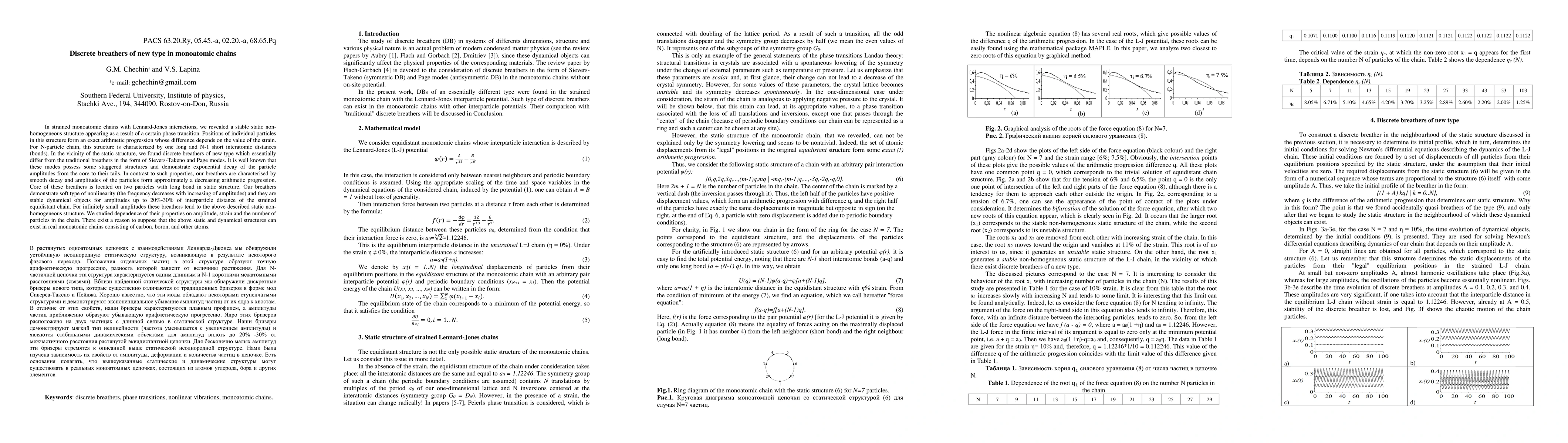 This paper reveals a stable static non-homogeneous structure in strained monoatomic chains with Lennard-Jones interactions, characterized by long and short interatomic distances. It introduces a new type of discrete breather with smooth decay and an arithmetic progression of particle amplitudes, differing from traditional Sievers-Takeno and Page modes, and stable for moderate amplitudes.
