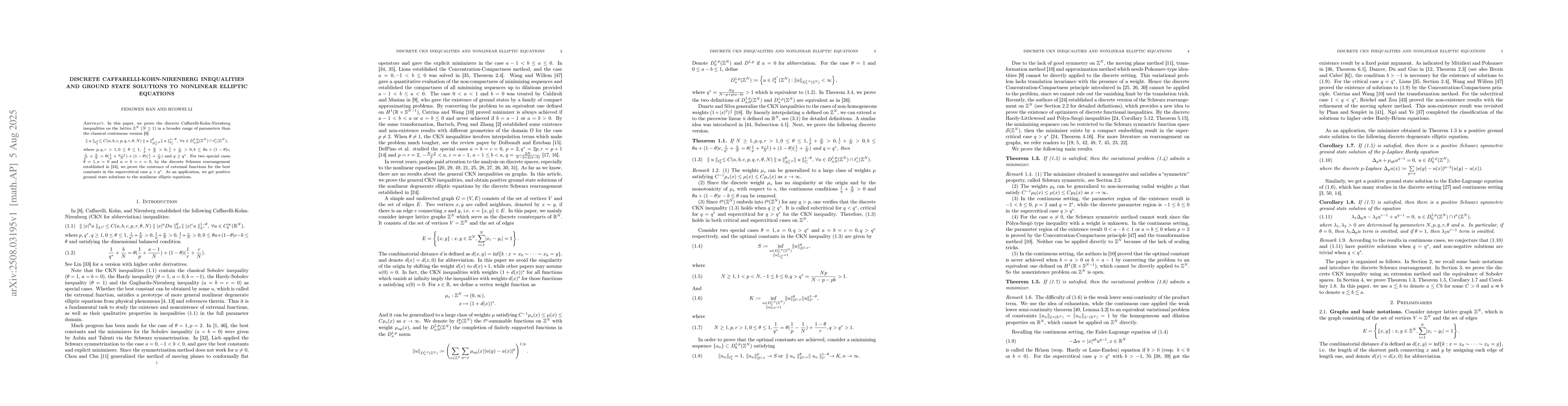 In this paper, we prove the discrete Caffarelli-Kohn-Nirenberg inequalities on the lattice $\mathbb{Z}^{N}$ ($N\geq 1$) in a broader range of parameters than the classical continuous version [8]: \[ \parallel u\parallel_{\ell_{b}^{q}}\leq C(a,b,c,p,q,r,\theta,N)\parallel u\parallel_{D_{a}^{1,p}}^{\theta}\parallel u\parallel_{\ell_{c}^{r}}^{1-\theta},\:\forall u\in D_{a,0}^{1,p}(\mathbb{Z}^{N}) \cap \ell_c ^r(\mathbb{Z}^{N}), \] where $p,q,r>1,0\leq\theta\leq1$, $\frac{1}{p}+\frac{a}{N}>0,\frac{1}{r}+\frac{c}{N}>0,b\leq\theta a+(1-\theta)c,$$\frac{1}{q^{\ast}}+\frac{b}{N}= \theta(\frac{1}{p}+\frac{a-1}{N})+(1-\theta)(\frac{1}{r}+\frac{c}{N})$ and $q\geq q^{\ast}$. For two special cases $\theta=1,a=0$ and $a=b=c=0$, by the discrete Schwarz rearrangement established in [24], we prove the existence of extremal functions for the best constants in the supercritical case $q>q^{\ast}$. As an application, we get positive ground state solutions to the nonlinear elliptic equations.