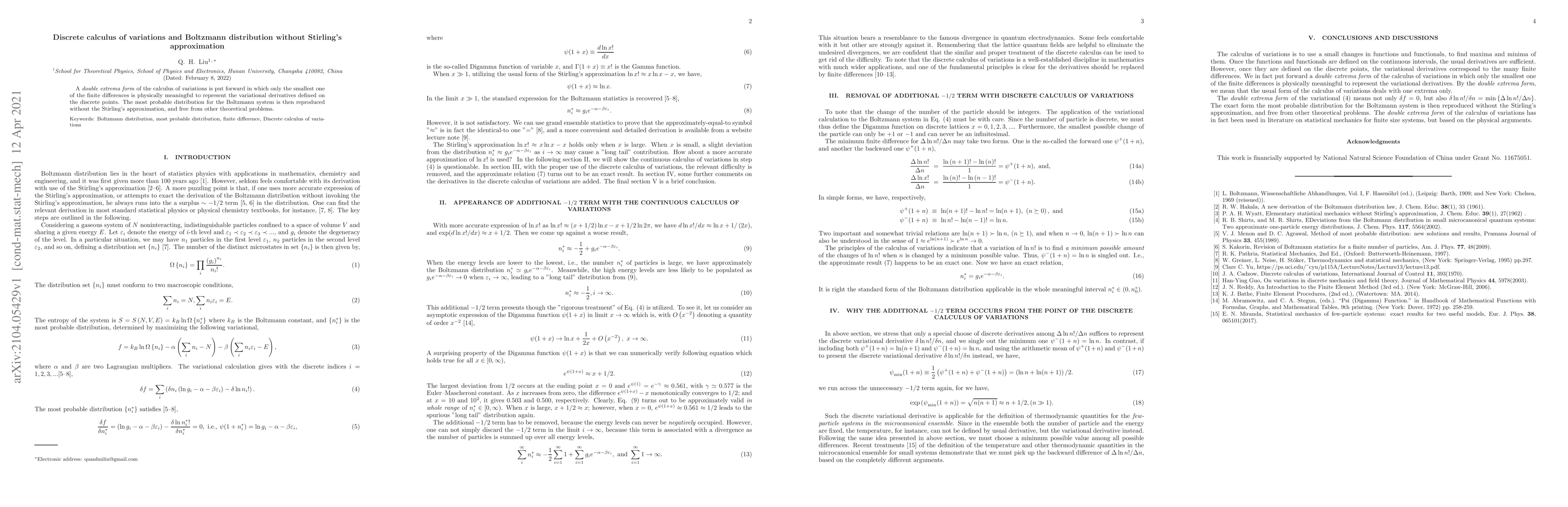 This paper introduces a double extrema form in discrete calculus of variations, where only the smallest finite difference is meaningful. It derives the most probable Boltzmann distribution without using Stirling's approximation, thus avoiding theoretical issues.