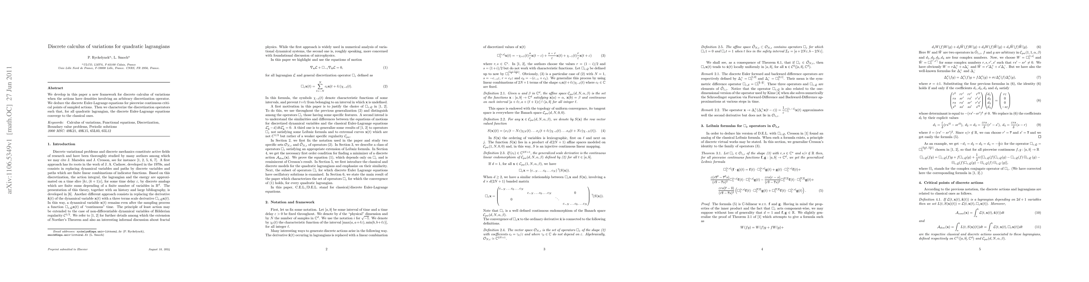This paper introduces a new framework for discrete calculus of variations with quadratic lagrangians, deriving discrete Euler-Lagrange equations for sampled actions and characterizing discretization operators that ensure convergence to classical Euler-Lagrange equations.