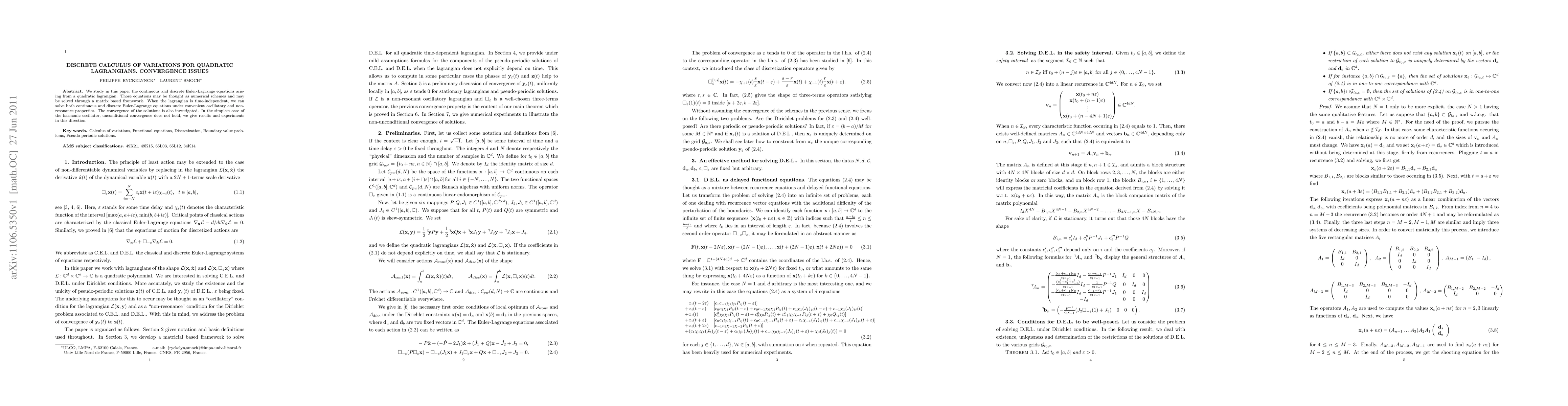 This paper investigates continuous and discrete Euler-Lagrange equations derived from quadratic Lagrangians, solving them using a matrix-based framework. It examines convergence issues, finding that while oscillatory and non-resonance properties allow for solutions, unconditional convergence does not hold for the harmonic oscillator, with specific results and experiments provided.