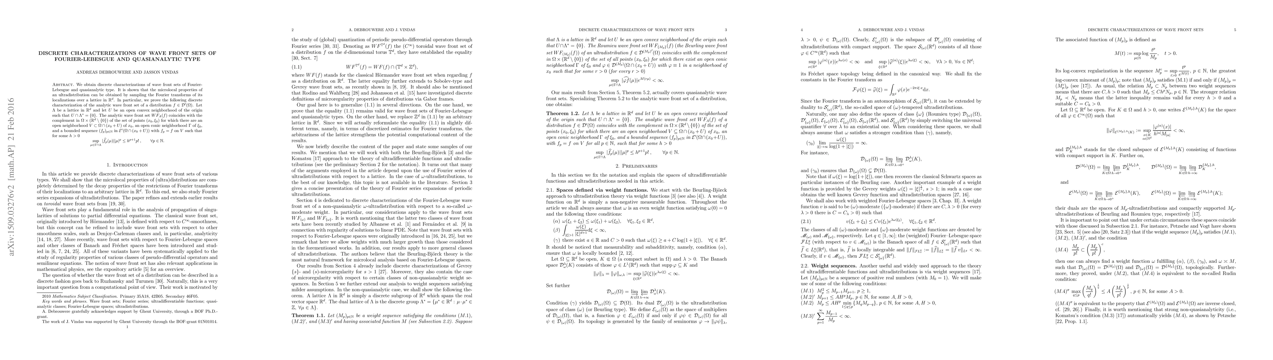 We obtain discrete characterizations of wave front sets of Fourier-Lebesgue and quasianalytic type. It is shown that the microlocal properties of an ultradistribution can be obtained by sampling the Fourier transforms of its localizations over a lattice in $\mathbb{R}^{d}$. In particular, we prove the following discrete characterization of the analytic wave front set of a distribution $f\in\mathcal{D}'(\Omega)$. Let $\Lambda$ be a lattice in $\mathbb{R}^{d}$ and let $U$ be an open convex neighborhood of the origin such that $U\cap\Lambda^{*}=\{0\}$. The analytic wave front set $WF_{A}(f)$ coincides with the complement in $\Omega\times(\mathbb{R}^{d}\setminus\{0\})$ of the set of points $(x_0,\xi_0)$ for which there are an open neighborhood $V\subset \Omega\cap (x_0+U)$ of $x_0$, an open conic neighborhood $\Gamma$ of $\xi_0$, and a bounded sequence $(f_p)_{p \in \mathbb{N}}$ in $\mathcal{E}'(\Omega\cap (x_0+U))$ with $f_p= f$ on $V$ such that for some $h > 0$ \[ \sup_{\mu \in \Gamma \cap \Lambda} |\widehat{f_p} (\mu)| |\mu|^p \leq h^{p+1}p!\:, \qquad \forall p \in \mathbb{N}. \]