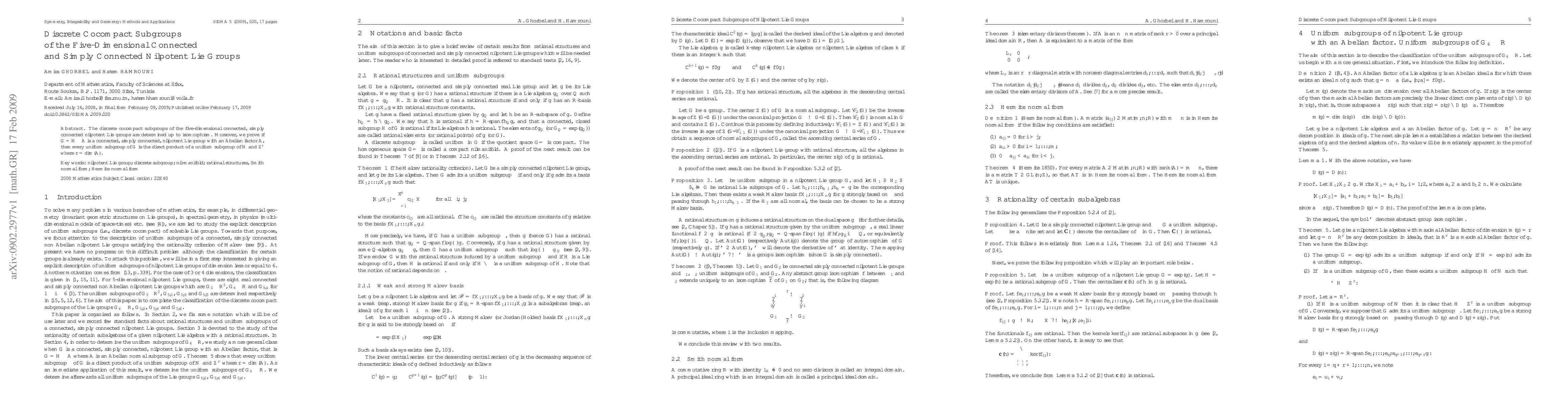 Summary: The paper determines discrete cocompact subgroups of five-dimensional connected, simply connected nilpotent Lie groups up to isomorphism and proves that uniform subgroups of such groups with an Abelian factor decompose into the product of a uniform subgroup of the nilpotent component and ${\mathbb Z}^r$.