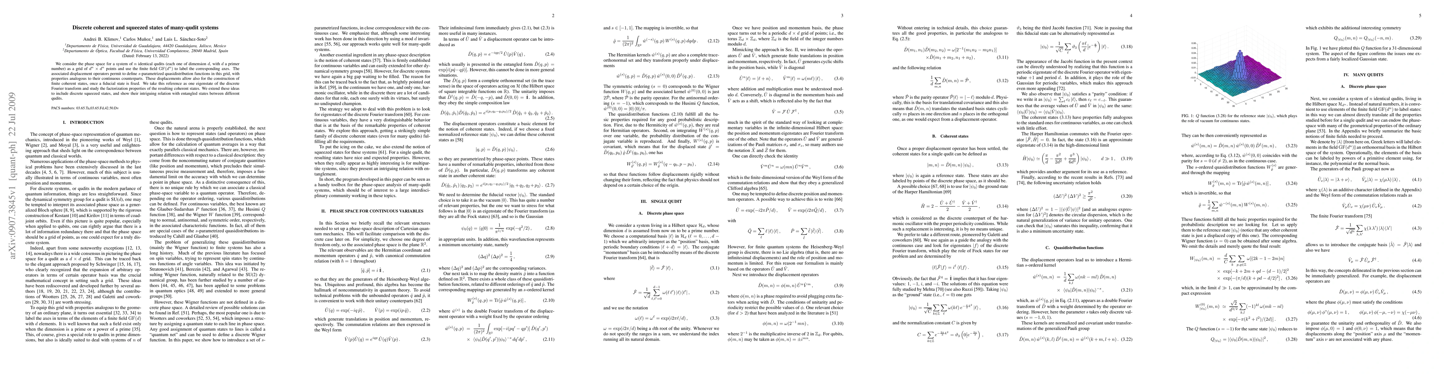 This paper explores the phase space of many-qudit systems, defining quasidistribution functions and coherent states using finite field labeling. It constructs discrete squeezed states and investigates their entanglement properties, revealing connections to factorization and entanglement among qudits.