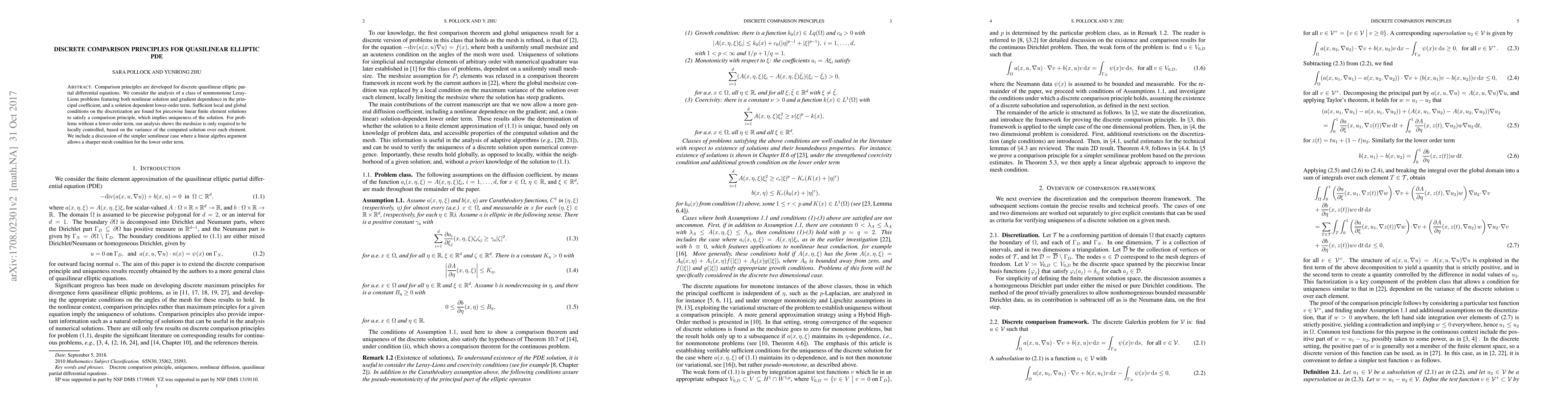 Researchers develop discrete comparison principles for quasilinear elliptic PDEs, finding sufficient conditions on discretization that imply uniqueness of the solution and mesh size requirements for certain terms.