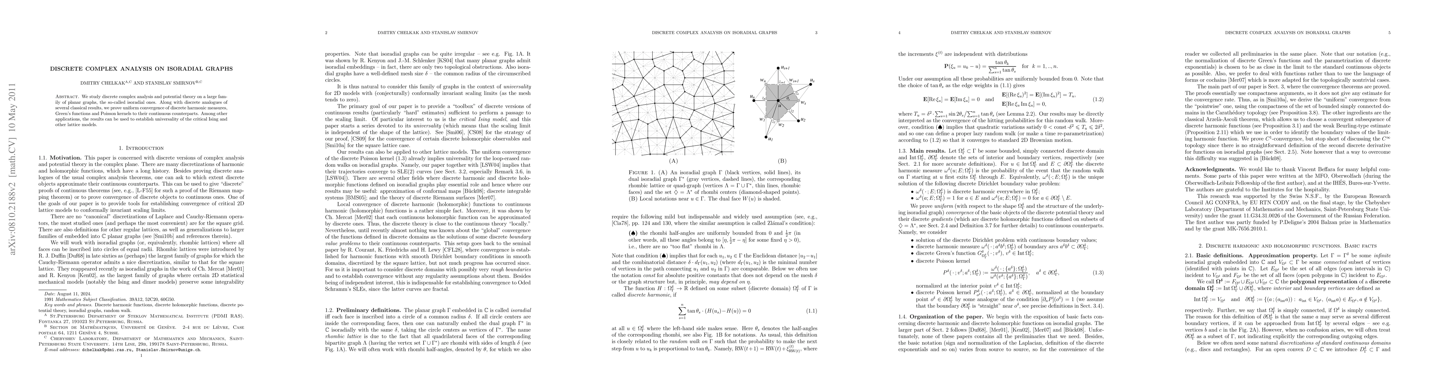 This paper investigates discrete complex analysis and potential theory on isoradial graphs, proving the uniform convergence of discrete harmonic measures, Green's functions, and Poisson kernels to their continuous counterparts, with applications to the universality of critical Ising and other lattice models.