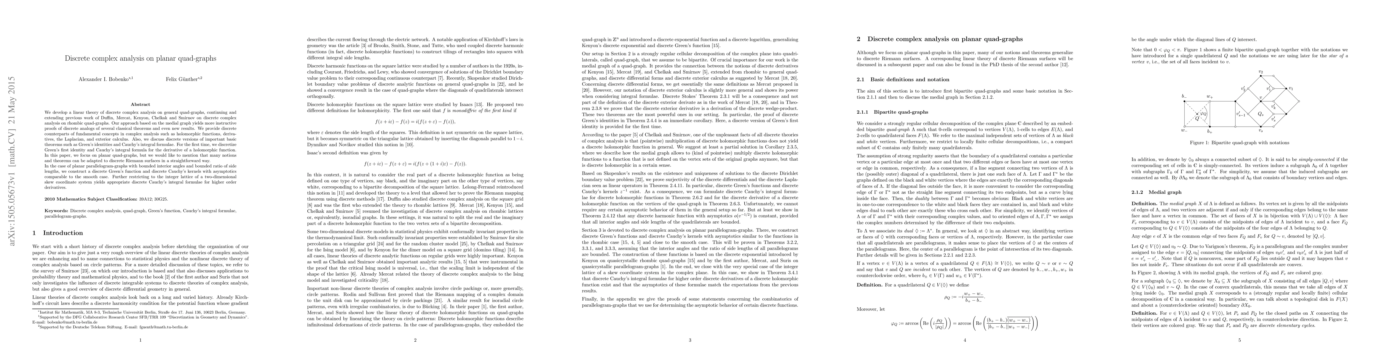 The paper presents a comprehensive theory of discrete complex analysis on quad-graphs, introducing discrete versions of holomorphic functions, derivatives, Laplacian, and Cauchy's integral formulas, along with discrete Green's functions and kernels.