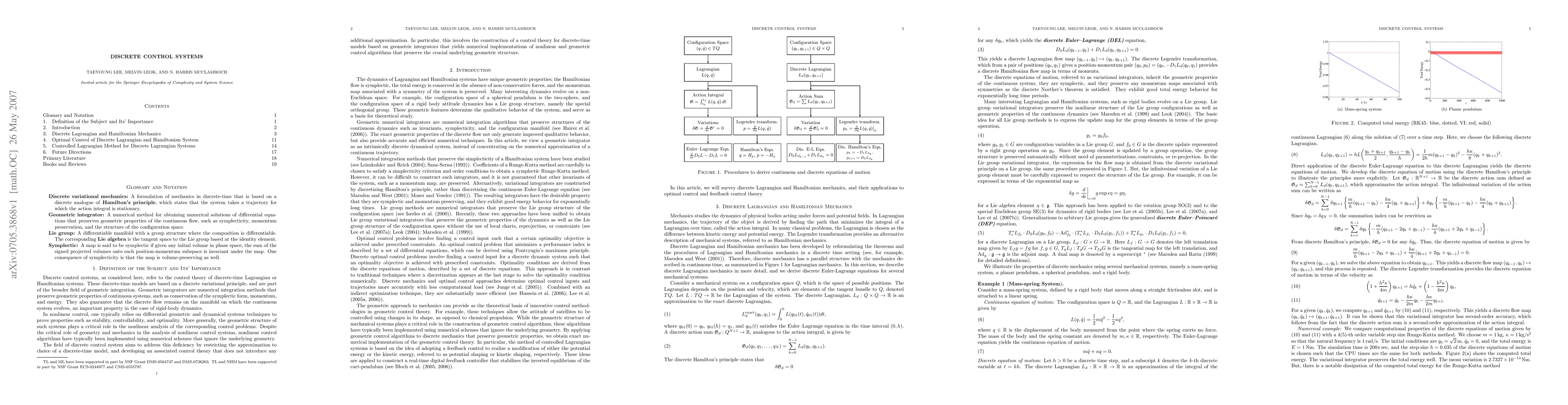 Discrete control systems, as considered here, refer to the control theory of discrete-time Lagrangian or Hamiltonian systems. These discrete-time models are based on a discrete variational principle, and are part of the broader field of geometric integration. Geometric integrators are numerical integration methods that preserve geometric properties of continuous systems, such as conservation of the symplectic form, momentum, and energy. They also guarantee that the discrete flow remains on the manifold on which the continuous system evolves, an important property in the case of rigid-body dynamics. In nonlinear control, one typically relies on differential geometric and dynamical systems techniques to prove properties such as stability, controllability, and optimality. More generally, the geometric structure of such systems plays a critical role in the nonlinear analysis of the corresponding control problems. Despite the critical role of geometry and mechanics in the analysis of nonlinear control systems, nonlinear control algorithms have typically been implemented using numerical schemes that ignore the underlying geometry. The field of discrete control system aims to address this deficiency by restricting the approximation to choice of a discrete-time model, and developing an associated control theory that does not introduce any additional approximation. In particular, this involves the construction of a control theory for discrete-time models based on geometric integrators that yields numerical implementations of nonlinear and geometric control algorithms that preserve the crucial underlying geometric structure.