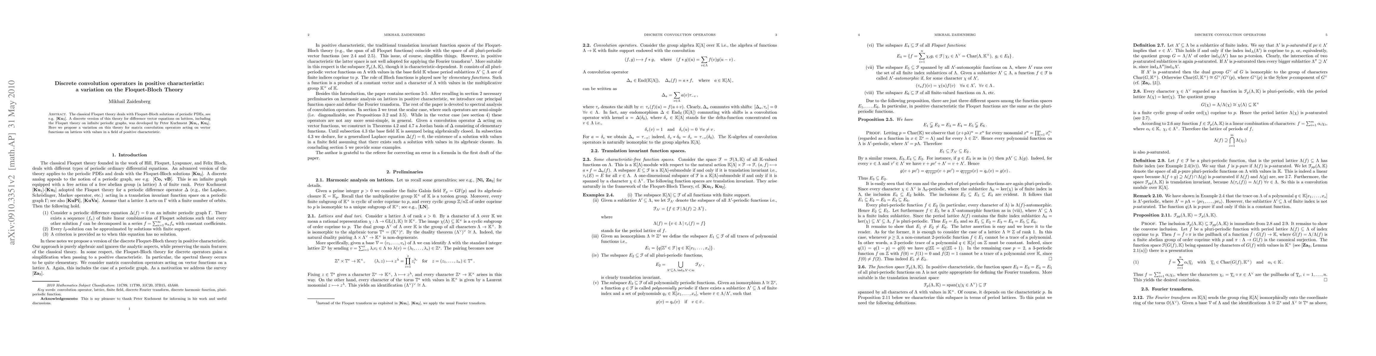 The classical Floquet theory deals with Floquet-Bloch solutions of periodic PDEs (see e.g., P. Kuchment. Floquet Theory for Partial Differential Equations. Basel: Birkhauser, 1993). Peter Kuchment developed as well a discrete version of this theory for difference vector equations on lattices, including the Floquet theory on infinite periodic graphs. Here we propose a variation on this theory for matrix convolution operators acting on vector functions on lattices with values in a field of positive characteristic.