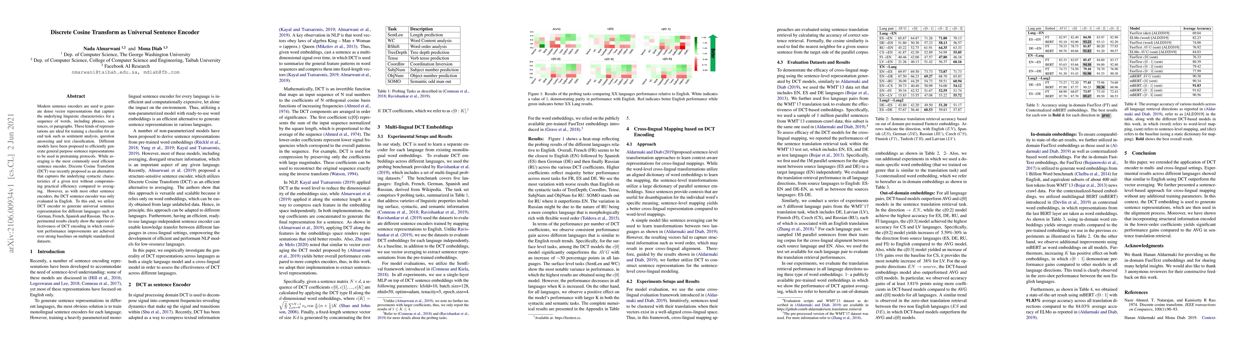 Modern sentence encoders are used to generate dense vector representations that capture the underlying linguistic characteristics for a sequence of words, including phrases, sentences, or paragraphs. These kinds of representations are ideal for training a classifier for an end task such as sentiment analysis, question answering and text classification. Different models have been proposed to efficiently generate general purpose sentence representations to be used in pretraining protocols. While averaging is the most commonly used efficient sentence encoder, Discrete Cosine Transform (DCT) was recently proposed as an alternative that captures the underlying syntactic characteristics of a given text without compromising practical efficiency compared to averaging. However, as with most other sentence encoders, the DCT sentence encoder was only evaluated in English. To this end, we utilize DCT encoder to generate universal sentence representation for different languages such as German, French, Spanish and Russian. The experimental results clearly show the superior effectiveness of DCT encoding in which consistent performance improvements are achieved over strong baselines on multiple standardized datasets.