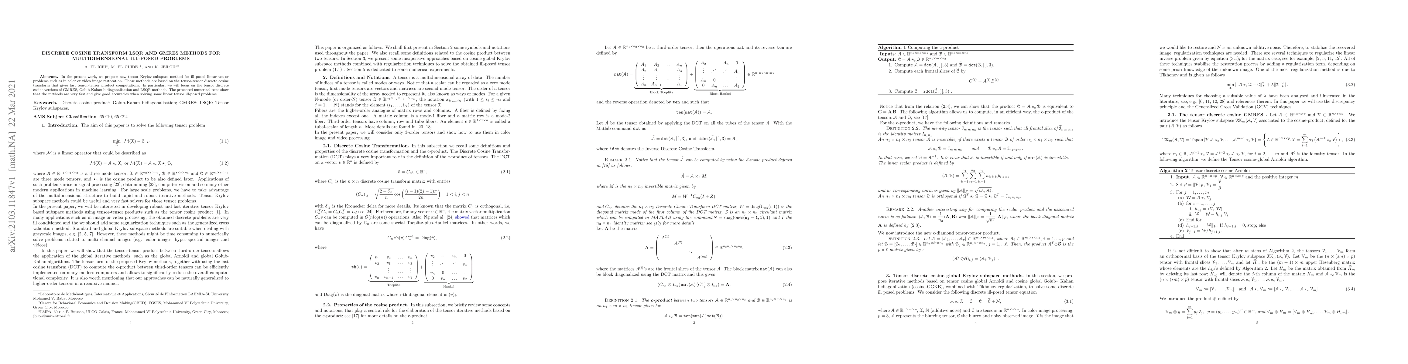 In the present work, we propose new tensor Krylov subspace method for ill posed linear tensor problems such as in color or video image restoration. Those methods are based on the tensor-tensor discrete cosine transform that gives fast tensor-tensor product computations. In particular, we will focus on the tensor discrete cosine versions of GMRES, Golub-Kahan bidiagonalisation and LSQR methods. The presented numerical tests show that the methods are very fast and give good accuracies when solving some linear tensor ill-posed problems.