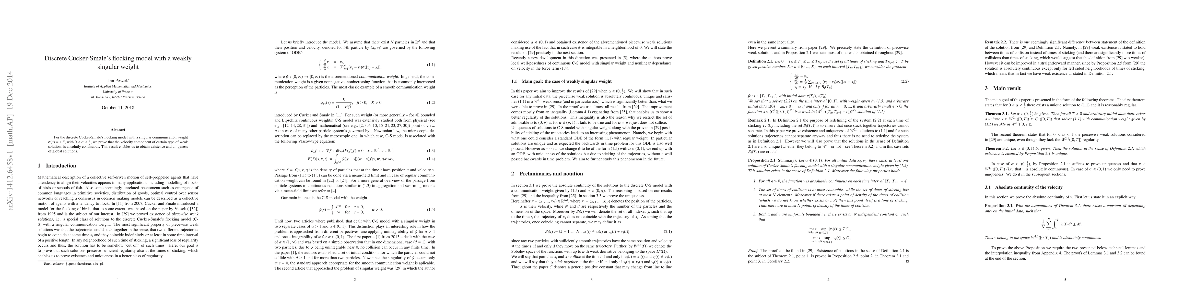 This paper proves that in the discrete Cucker-Smale's flocking model with a weakly singular weight, the velocity component of certain weak solutions is absolutely continuous, leading to the existence and uniqueness of global solutions.
