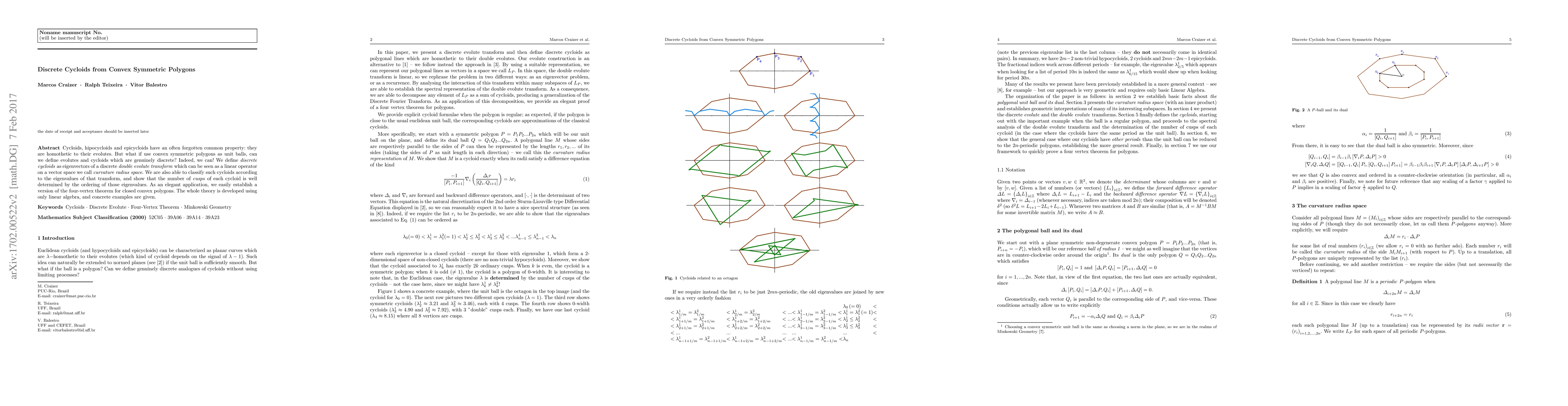 This paper explores the concept of discrete cycloids derived from convex symmetric polygons, defining them as eigenvectors of a discrete double evolute transform in curvature radius space. It classifies these cycloids by their eigenvalues and demonstrates their cusp count, ultimately applying this theory to establish a version of the four-vertex theorem for closed convex polygons using linear algebra.