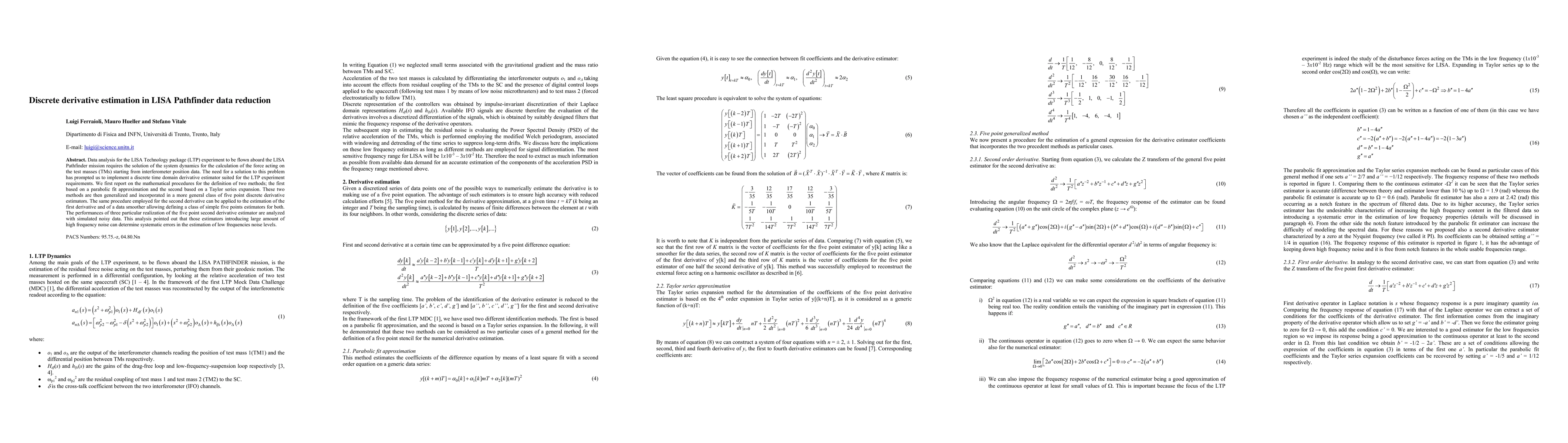 This paper presents methods for estimating discrete derivatives in data reduction for the LISA Pathfinder mission, focusing on the system dynamics for test masses. It introduces two initial derivative estimation methods—parabolic fit and Taylor series—and generalizes them into five-point estimators. Performance analysis of these estimators reveals that high-frequency noise can introduce systematic errors in low-frequency noise level estimations.