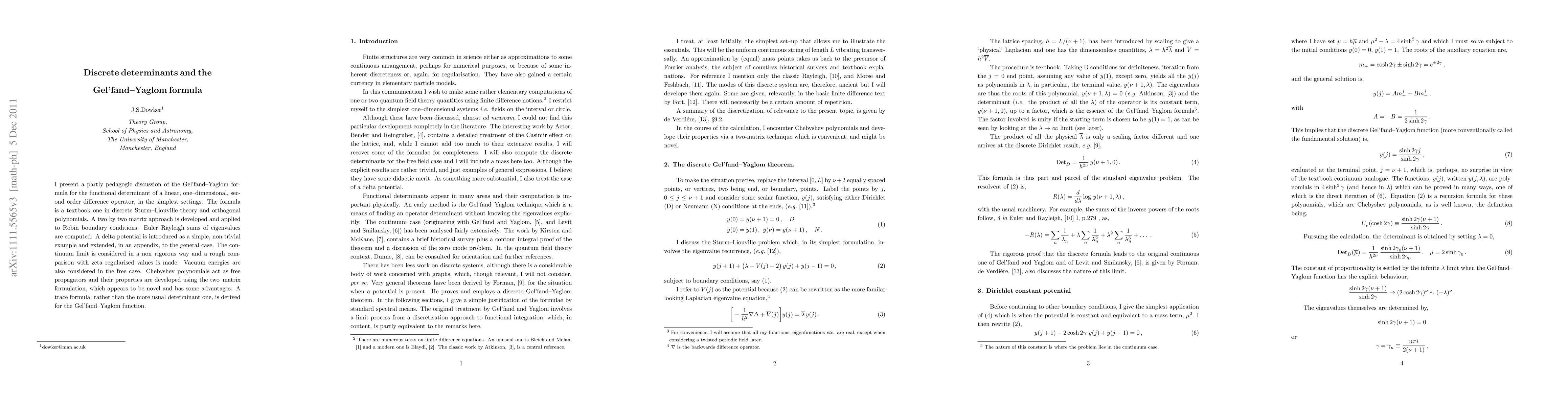 I present a partly pedagogic discussion of the Gel'fand-Yaglom formula for the functional determinant of a one-dimensional, second order difference operator, in the simplest settings. The formula is a textbook one in discrete Sturm-Liouville theory and orthogonal polynomials. A two by two matrix approach is developed and applied to Robin boundary conditions. Euler-Rayleigh sums of eigenvalues are computed. A delta potential is introduced as a simple, non-trivial example and extended, in an appendix, to the general case. The continuum limit is considered in a non--rigorous way and a rough comparison with zeta regularised values is made. Vacuum energies are also considered in the free case. Chebyshev polynomials act as free propagators and their properties are developed using the two-matrix formulation, which has some advantages and appears to be novel. A trace formula, rather than a determinant one, is derived for the Gel'fand-Yaglom function.