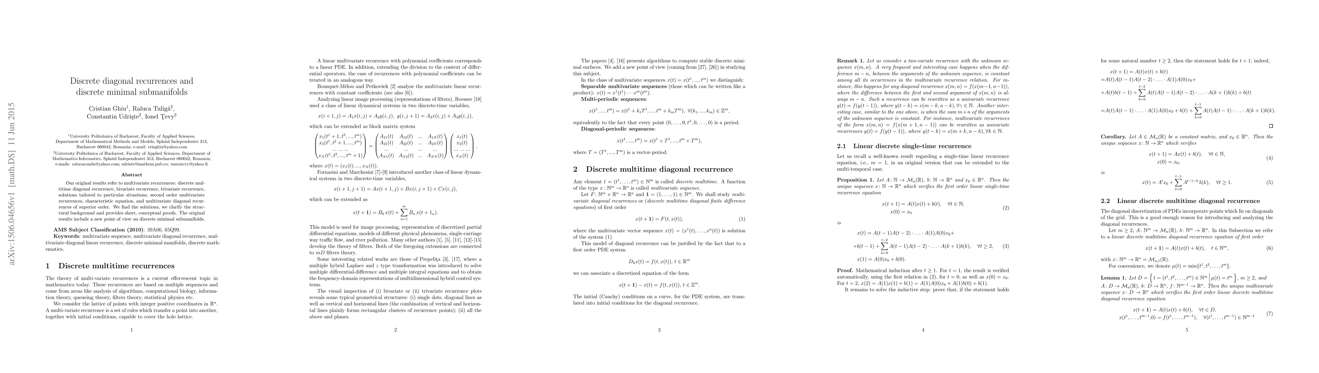 This paper explores multivariate recurrences, including discrete multitime diagonal recurrences and higher-order multivariate diagonal recurrences, providing solutions and structural insights. It also introduces a novel perspective on discrete minimal submanifolds.