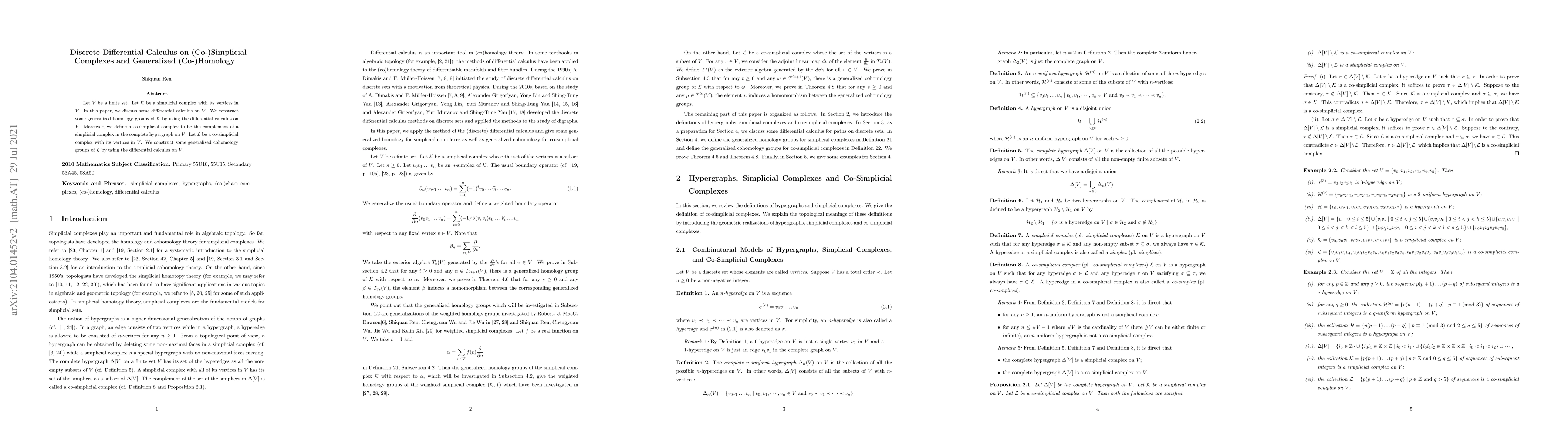 Let $V$ be a finite set. Let $\mathcal{K}$ be a simplicial complex with its vertices in $V$. In this paper, we discuss some differential calculus on $V$. We construct some generalized homology groups of $\mathcal{K}$ by using the differential calculus on $V$. Moreover, we define a co-simplicial complex to be the complement of a simplicial complex in the complete hypergraph on $V$. Let $\mathcal{L}$ be a co-simplicial complex with its vertices in $V$. We construct some generalized cohomology groups of $\mathcal{L}$ by using the differential calculus on $V$.