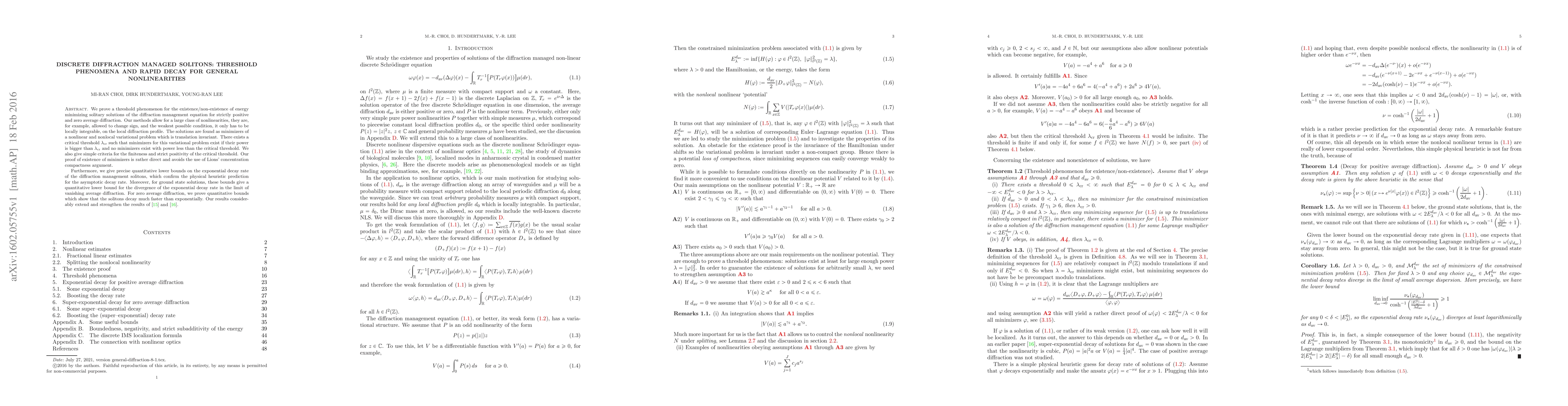 We prove a threshold phenomenon for the existence/non-existence of energy minimizing solitary solutions of the diffraction management equation for strictly positive and zero average diffraction. Our methods allow for a large class of nonlinearities, they are, for example, allowed to change sign, and the weakest possible condition, it only has to be locally integrable, on the local diffraction profile. The solutions are found as minimizers of a nonlinear and nonlocal variational problem which is translation invariant. There exists a critical threshold ?cr such that minimizers for this variational problem exist if their power is bigger than ?cr and no minimizers exist with power less than the critical threshold. We also give simple criteria for the finiteness and strict positivity of the critical threshold. Our proof of existence of minimizers is rather direct and avoids the use of Lions' concentration compactness argument. Furthermore, we give precise quantitative lower bounds on the exponential decay rate of the diffraction management solitons, which confirm the physical heuristic prediction for the asymptotic decay rate. Moreover, for ground state solutions, these bounds give a quantitative lower bound for the divergence of the exponential decay rate in the limit of vanishing average diffraction. For zero average diffraction, we prove quantitative bounds which show that the solitons decay much faster than exponentially. Our results considerably extend and strengthen the results of [15] and [16].