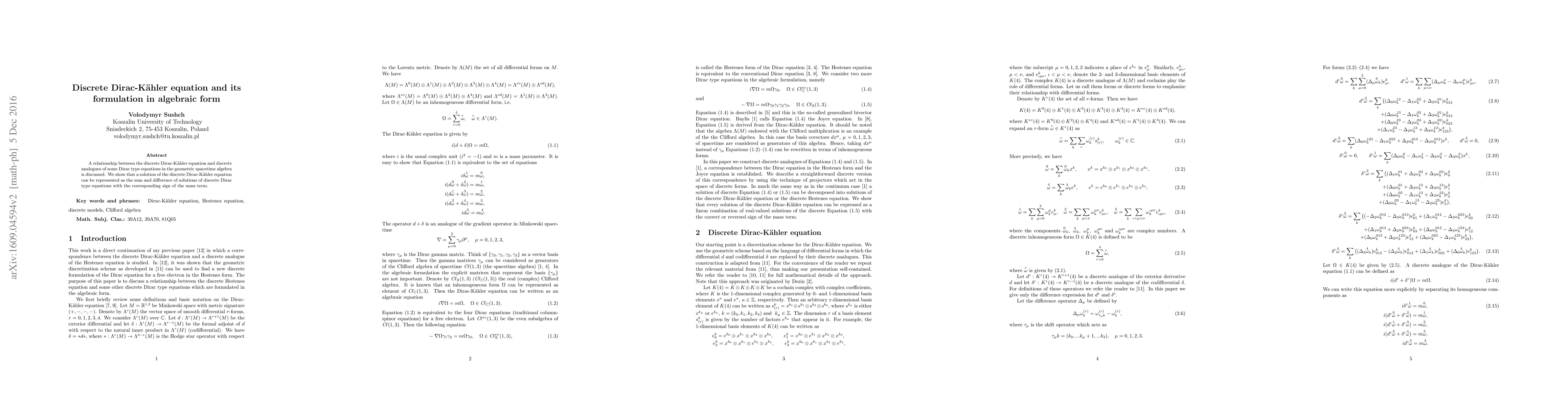 Summary: This paper explores the relationship between the discrete Dirac-K\"ahler equation and discrete analogues of Dirac-type equations within geometric spacetime algebra, demonstrating that solutions of the former can be expressed as combinations of solutions of the latter with appropriate mass term signs.