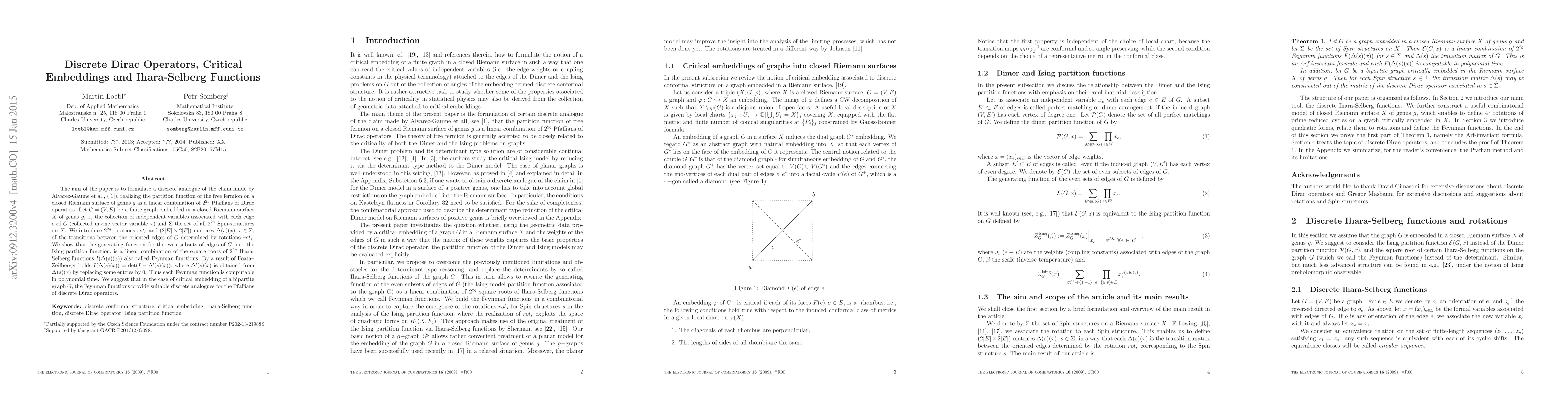 The paper formulates a discrete analogue of the partition function of the free fermion on a Riemann surface as a linear combination of Pfaffians of Dirac operators. It shows that the Ising partition function is a linear combination of square roots of Ihara-Selberg functions, computable in polynomial time, suggesting these functions serve as discrete analogues for Pfaffians in critical embeddings of bipartite graphs.