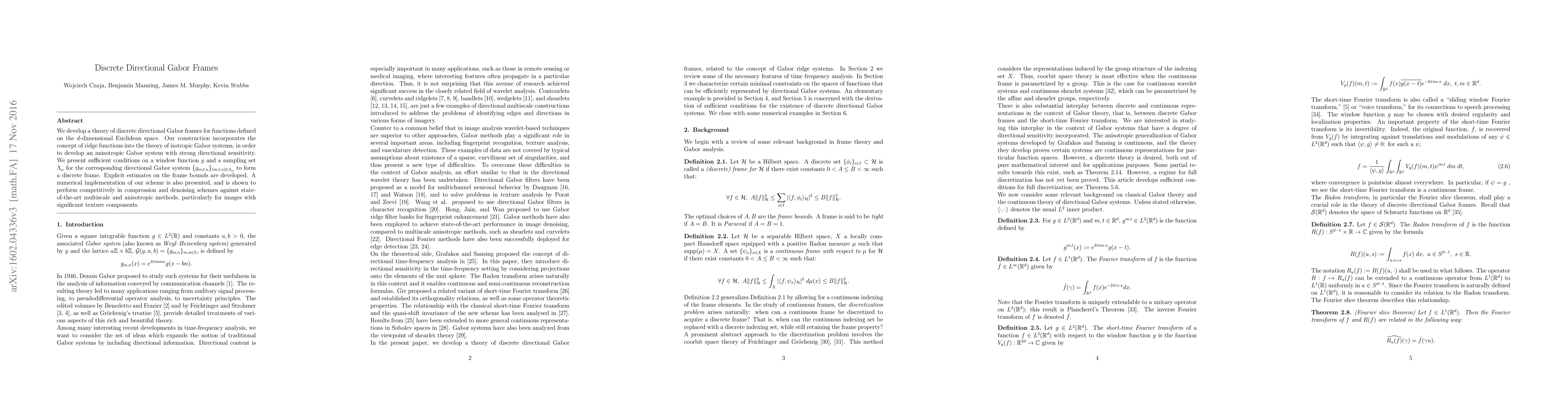 This paper develops a theory for discrete directional Gabor frames incorporating ridge functions into isotropic Gabor systems to create anisotropic Gabor systems with strong directional sensitivity. It provides sufficient conditions for frame formation and competitive numerical performance in compression and denoising.