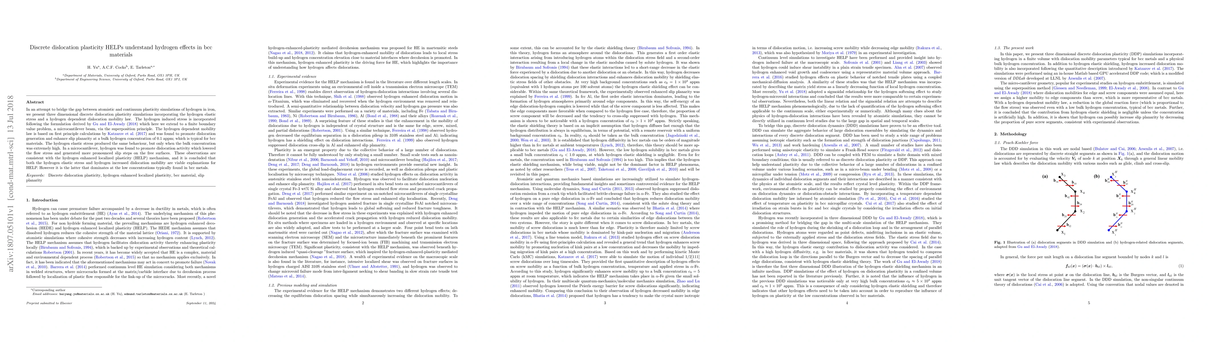 The paper presents a novel approach to incorporate hydrogen effects in discrete dislocation plasticity simulations, combining hydrogen elastic stress and hydrogen-dependent dislocation mobility laws.