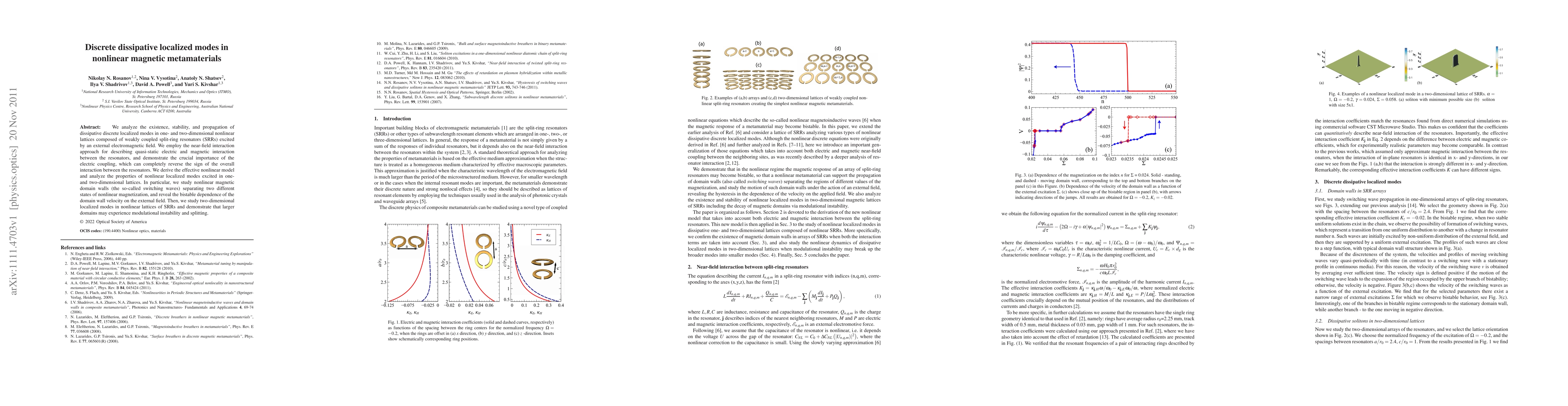 We analyze the existence, stability, and propagation of dissipative discrete localized modes in one- and two-dimensional nonlinear lattices composed of weakly coupled split-ring resonators (SRRs) excited by an external electromagnetic field. We employ the near-field interaction approach for describing quasi-static electric and magnetic interaction between the resonators, and demonstrate the crucial importance of the electric coupling, which can completely reverse the sign of the overall interaction between the resonators. We derive the effective nonlinear model and analyze the properties of nonlinear localized modes excited in one- and two-dimensional lattices. In particular, we study nonlinear magnetic domain walls (the so-called switching waves) separating two different states of nonlinear magnetization, and reveal the bistable dependence of the domain wall velocity on the external field. Then, we study two-dimensional localized modes in nonlinear lattices of SRRs and demonstrate that larger domains may experience modulational instability and splitting.