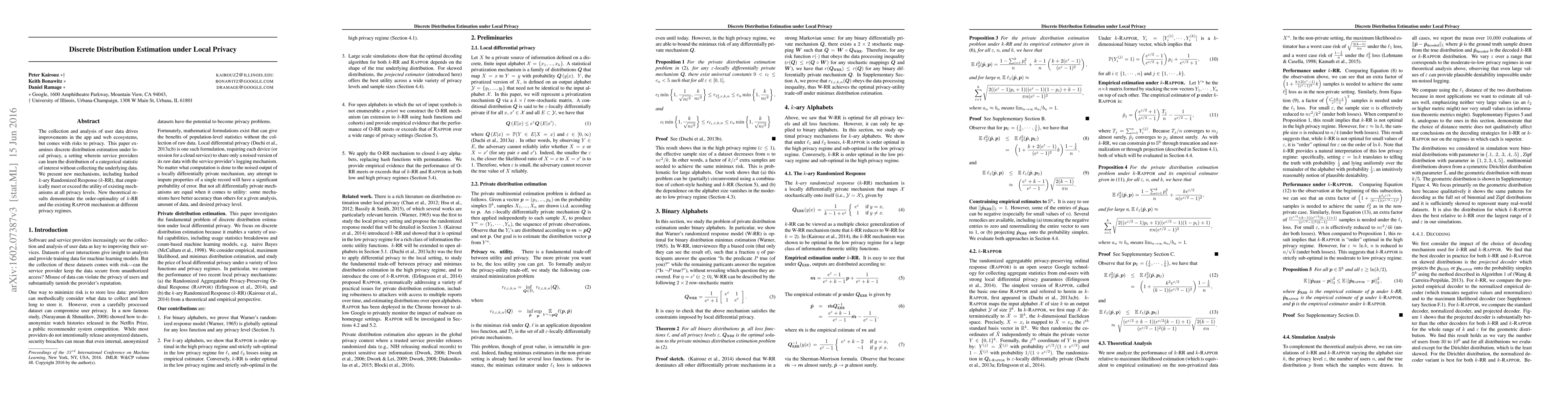 This paper introduces new mechanisms for estimating discrete distributions under local privacy, specifically the hashed K-ary Randomized Response (KRR), which outperforms existing methods in utility across various privacy levels. Theoretical results confirm the order-optimality of KRR and the RAPPOR mechanism in different privacy regimes.