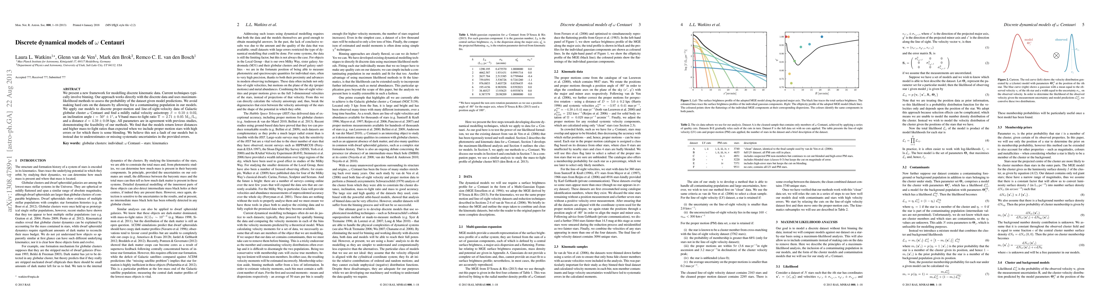 We present a new framework for modelling discrete kinematic data. Current techniques typically involve binning. Our approach works directly with the discrete data and uses maximum-likelihood methods to assess the probability of the dataset given model predictions. We avoid making hard cuts on the datasets by allowing for a contaminating population in our models. We apply our models to discrete proper-motion and line-of-sight-velocity data of Galactic globular cluster omega Centauri and find a mildly radial velocity anisotropy beta = 0.10 +/- 0.02, an inclination angle i = 50 +/- 1 deg, a V-band mass-to-light ratio Upsilon = 2.71 +/- 0.05 Msun/Lsun and a distance d = 4.59 +/- 0.08 kpc. All parameters are in agreement with previous studies, demonstrating the feasibility of our methods. We find that the models return lower distances and higher mass-to-light ratios than expected when we include proper motion stars with high errors or for which there is some blending. We believe this not a fault of our models but is instead due to underestimates or missing systematic uncertainties in the provided errors.