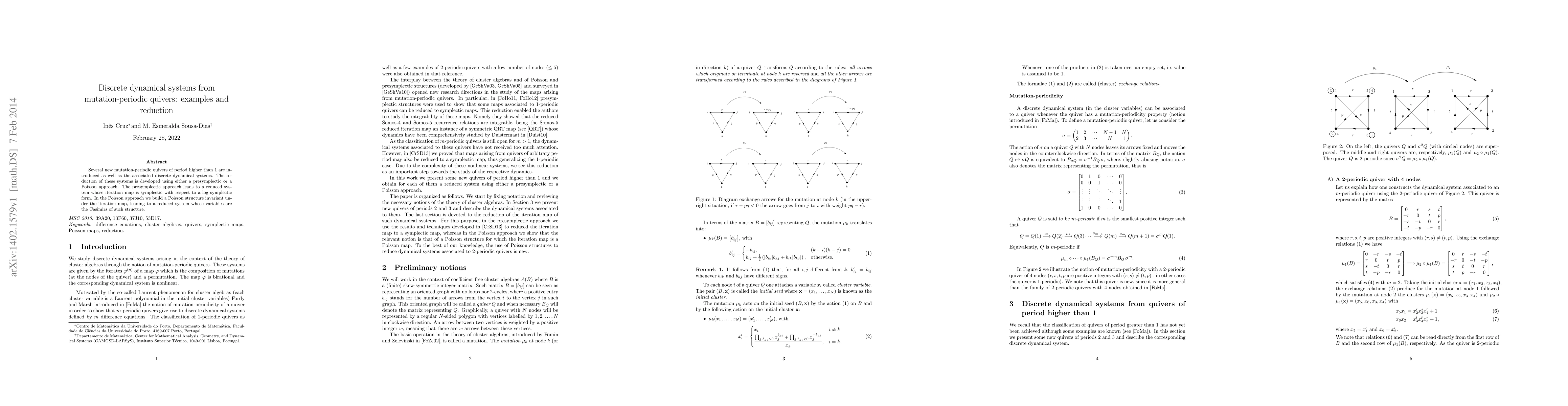 Researchers introduced new mutation-periodic quivers with high periods and reduced their associated discrete dynamical systems using presymplectic and Poisson approaches, leading to symplectic and invariant structures respectively.