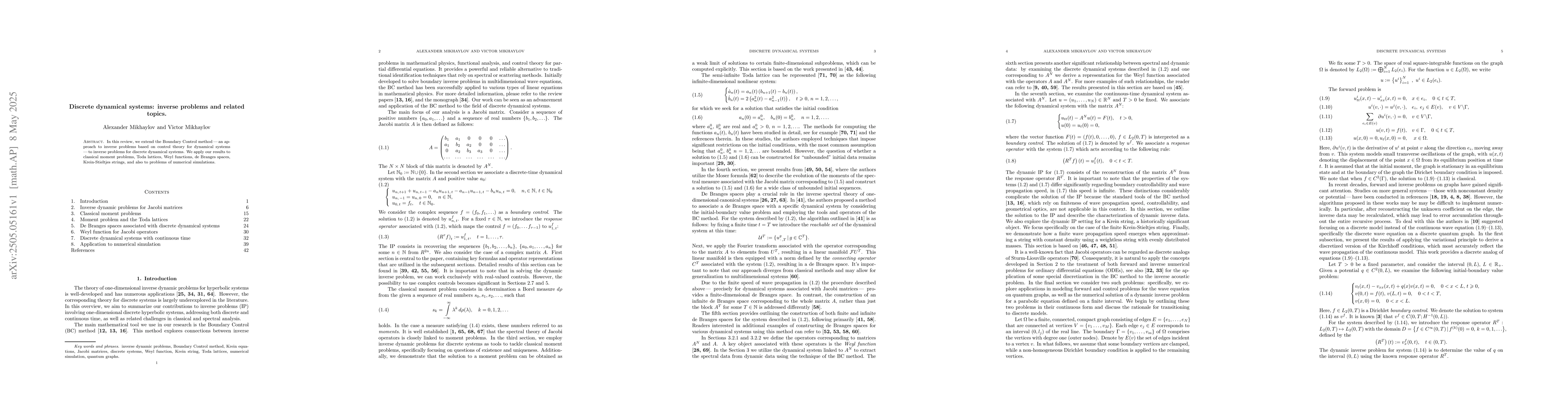In this review, we extend the Boundary Control method\, -- \,an approach to inverse problems based on control theory for dynamical systems \, -- \,to inverse problems for discrete dynamical systems. We apply our results to classical moment problems, Toda lattices, Weyl functions, de Branges spaces, Krein-Stieltjes strings, and also to problems of numerical simulations.