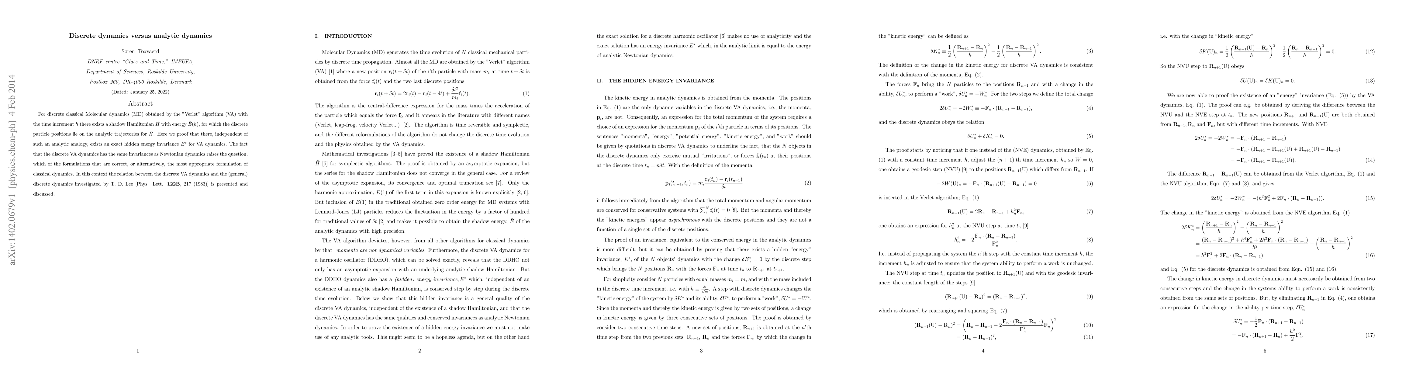 For discrete classical Molecular dynamics (MD) obtained by the "Verlet" algorithm (VA) with the time increment $h$ there exists a shadow Hamiltonian $\tilde{H}$ with energy $\tilde{E}(h)$, for which the discrete particle positions lie on the analytic trajectories for $\tilde{H}$. Here we proof that there, independent of such an analytic analogy, exists an exact hidden energy invariance $E^*$ for VA dynamics. The fact that the discrete VA dynamics has the same invariances as Newtonian dynamics raises the question, which of the formulations that are correct, or alternatively, the most appropriate formulation of classical dynamics. In this context the relation between the discrete VA dynamics and the (general) discrete dynamics investigated by T. D. Lee [Phys. Lett. $\textbf{122B}$, 217 (1983)] is presented and discussed.