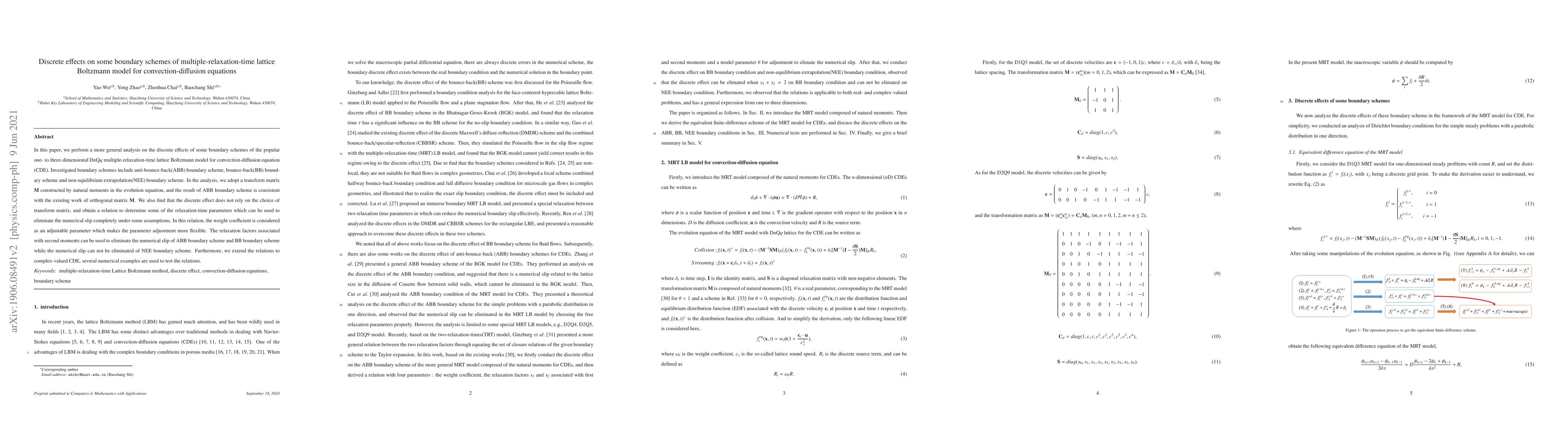 This paper analyzes discrete effects of various boundary schemes in the DnQq multiple-relaxation-time lattice Boltzmann model for convection-diffusion equations, finding that the numerical slip can be eliminated for certain schemes using adjustable relaxation-time parameters. The study extends these findings to complex-valued convection-diffusion equations and validates the results with numerical examples.