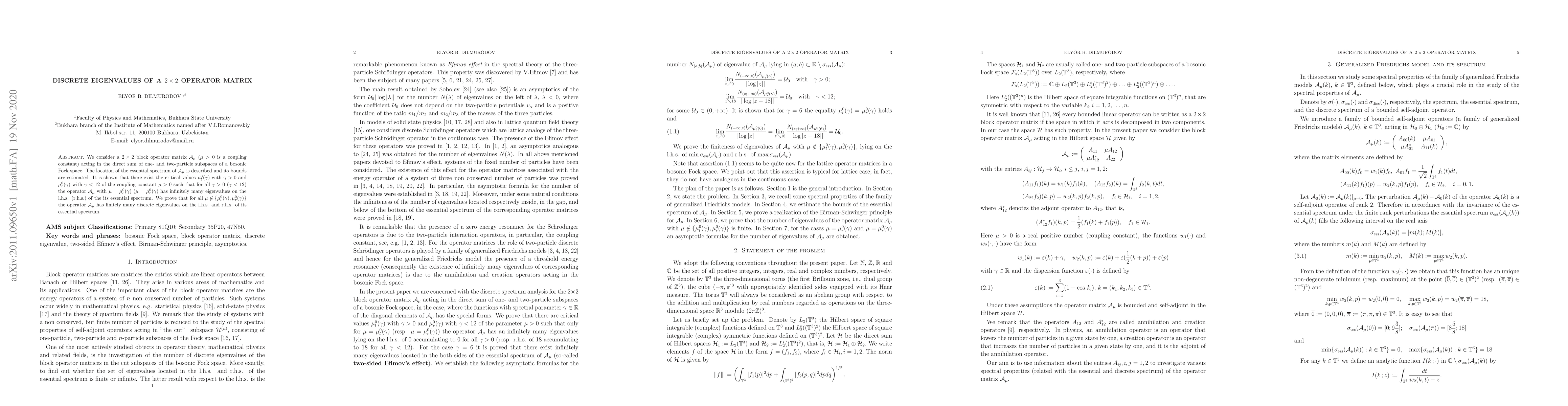 A $2 imes 2$ block operator matrix is analyzed for its essential spectrum bounds, with critical values of the coupling constant identified that lead to infinitely many discrete eigenvalues on either side of the spectrum.