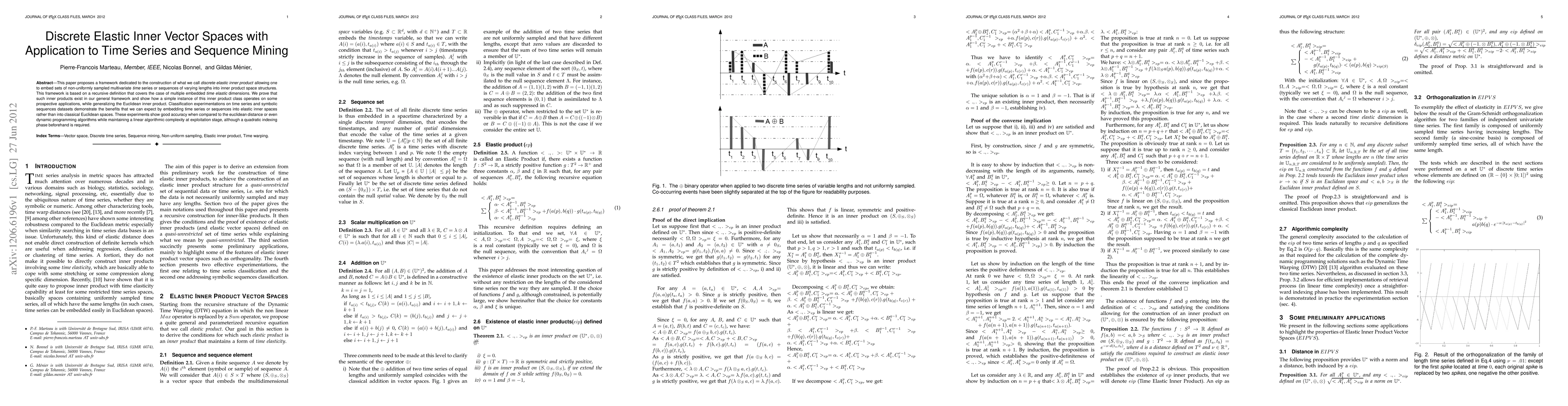 This paper proposes a framework dedicated to the construction of what we call discrete elastic inner product allowing one to embed sets of non-uniformly sampled multivariate time series or sequences of varying lengths into inner product space structures. This framework is based on a recursive definition that covers the case of multiple embedded time elastic dimensions. We prove that such inner products exist in our general framework and show how a simple instance of this inner product class operates on some prospective applications, while generalizing the Euclidean inner product. Classification experimentations on time series and symbolic sequences datasets demonstrate the benefits that we can expect by embedding time series or sequences into elastic inner spaces rather than into classical Euclidean spaces. These experiments show good accuracy when compared to the euclidean distance or even dynamic programming algorithms while maintaining a linear algorithmic complexity at exploitation stage, although a quadratic indexing phase beforehand is required.