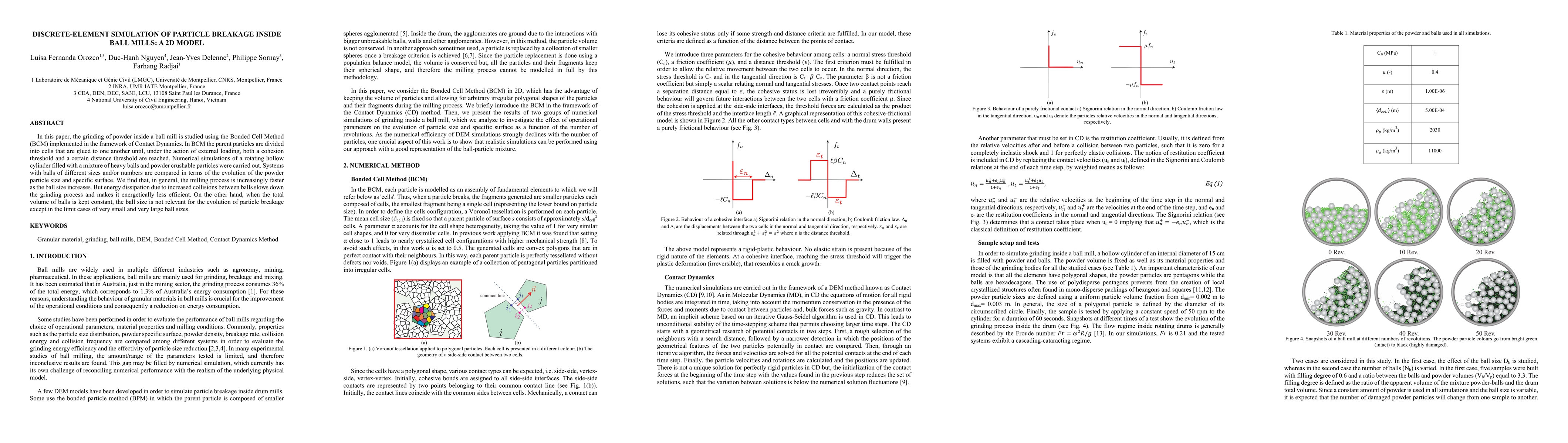 In this paper, the grinding of powder inside a ball mill is studied using the Bonded Cell Method (BCM) implemented in the framework of Contact Dynamics. In BCM the parent particles are divided into cells that are glued to one another until, under the action of external loading, both a cohesion threshold and a certain distance threshold are reached. Numerical simulations of a rotating hollow cylinder filled with a mixture of heavy balls and powder crushable particles were carried out. Systems with balls of different sizes and/or numbers are compared in terms of the evolution of the powder particle size and specific surface. We find that, in general, the milling process is increasingly faster as the ball size increases. But energy dissipation due to increased collisions between balls slows down the grinding process and makes it energetically less efficient. On the other hand, when the total volume of balls is kept constant, the ball size is not relevant for the evolution of particle breakage except in the limit cases of very small and very large ball sizes.
