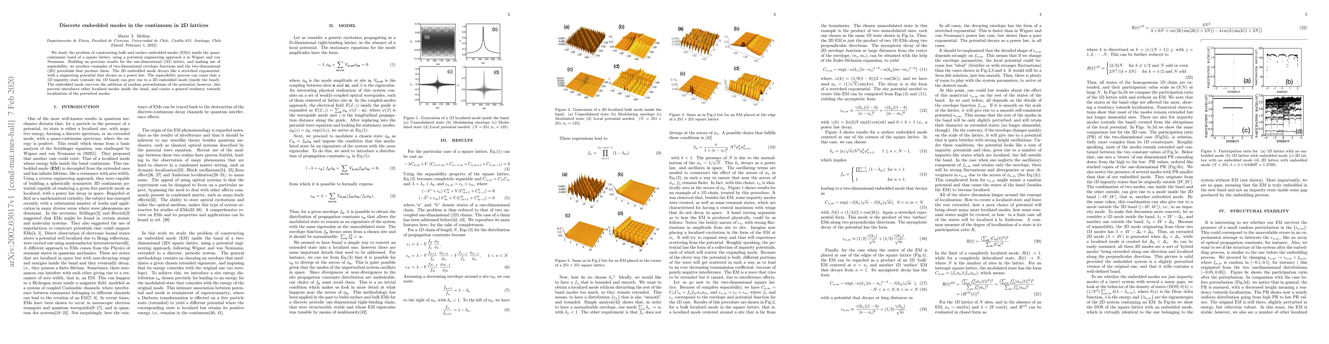 We study the problem of constructing bulk and surface embedded modes (EMs) inside the quasi-continuum band of a square lattice, using a potential engineering approach \`a la Wigner and von Neumann. Building on previous results for the one-dimensional (1D) lattice, and making use of separability, we produce examples of two-dimensional envelope functions and the two-dimensional (2D) potentials that produce them. The 2D embedded mode decays like a stretched exponential, with a supporting potential that decays as a power law. The separability process can cause that a 1D impurity state (outside the 1D band) can give rise to a 2D embedded mode (inside the band). The embedded mode survives the addition of random perturbations of the potential; however, this process introduces other localized modes inside the band, and causes a general tendency towards localization of the perturbed modes.