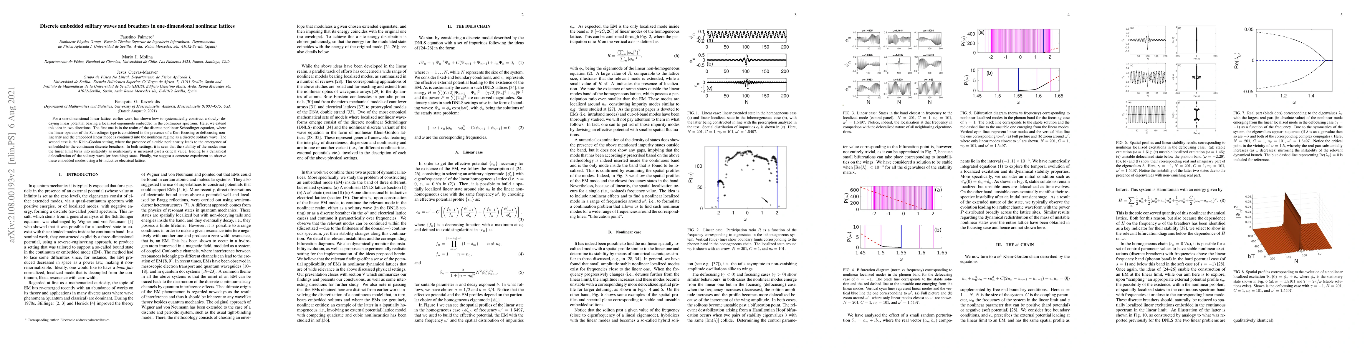 For a one-dimensional linear lattice, earlier work has shown how to systematically construct a slowly-decaying linear potential bearing a localized eigenmode embedded in the continuous spectrum. Here, we extend this idea in two directions: The first one is in the realm of the discrete nonlinear Schrodinger equation, where the linear operator of the Schrodinger type is considered in the presence of a Kerr focusing or defocusing nonlinearity and the embedded linear mode is continued into the nonlinear regime as a discrete solitary wave. The second case is the Klein-Gordon setting, where the presence of a cubic nonlinearity leads to the emergence of embedded-in-the-continuum discrete breathers. In both settings, it is seen that the stability of the modes near the linear limit turns into instability as nonlinearity is increased past a critical value, leading to a dynamical delocalization of the solitary wave (or breathing) state. Finally, we suggest a concrete experiment to observe these embedded modes using a bi-inductive electrical lattice.